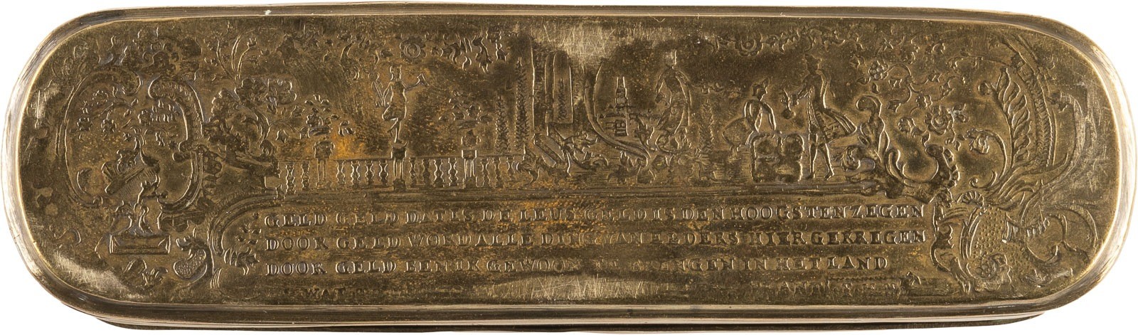 ISERLOH TOBACCO TIN German, Johann Heinrich Hamer, circa 1760 Brass, copper. 15.5 x 4.5 x 3.5 cm. Inscribed 'I. H. Hamer f.'. Rectangular shape with rounded ends and hinged lid. Brass lid and base with relief floral and figurative depictions, including the continents, and an inscription. Copper body. Traces of use.