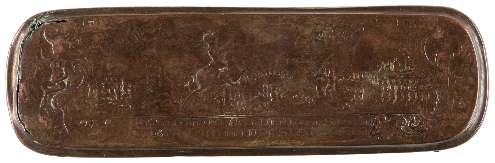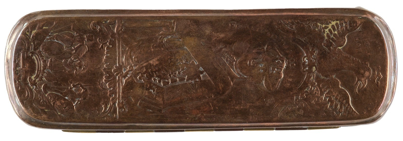 ISERLOHN TOBACCO TIN WITH 'FERDINAND OF BRUNSWICK' AND THE 'BATTLE OF KREFELD 1758' German, second half of the 18th century Brass, copper. 15.5 x 5 x 3 cm. Rectangular shape with rounded ends and hinged lid. Copper lid and base with a relief depiction of Ferdinand of Brunswick and a battle scene with an inscription referring to the Battle of Krefeld on June 23, 1758, in which the Count of Clermont was driven back to the left bank of the Rhine by Ferdinand of Brunswick. Brass body. Partially damaged, corroded.