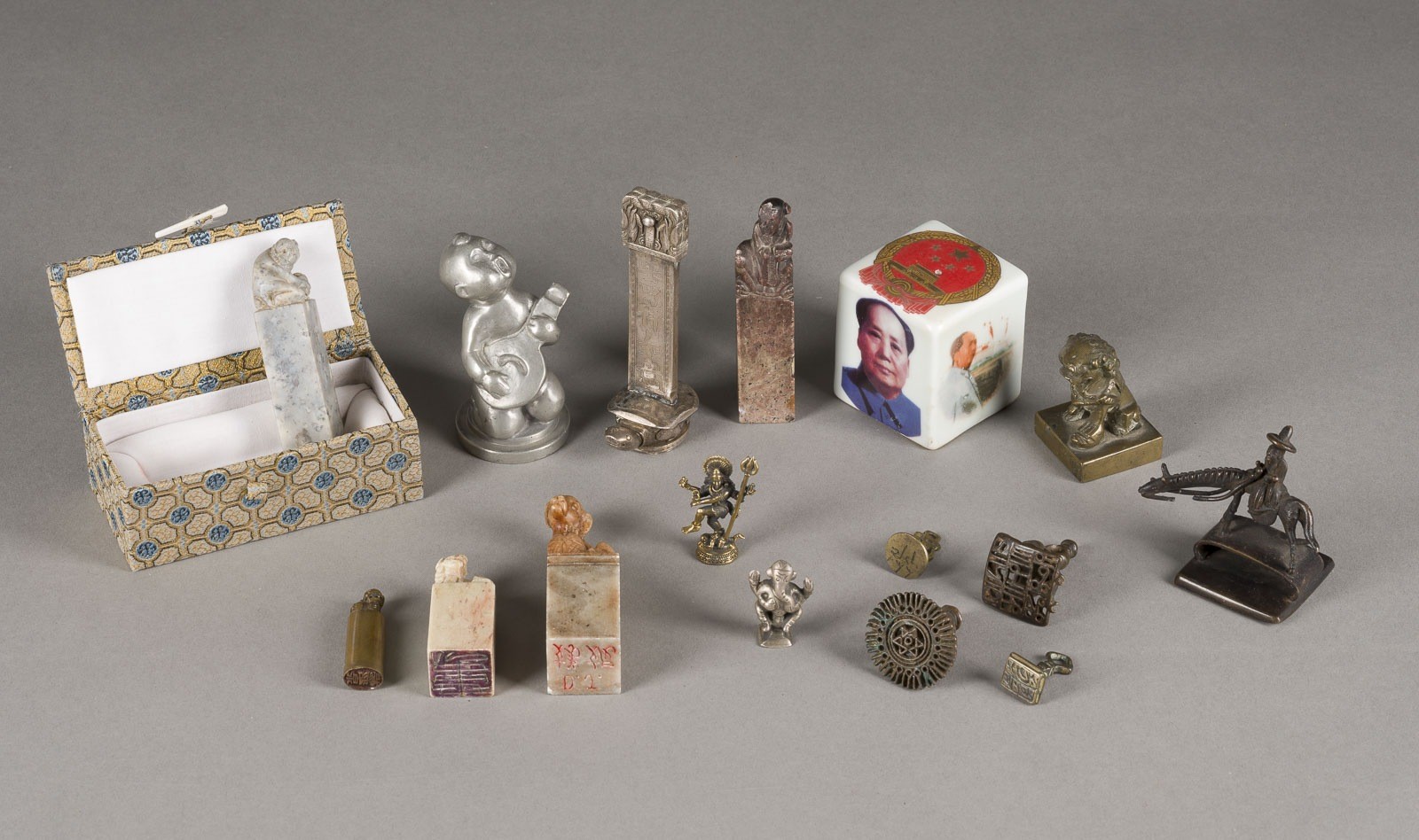 COLLECTION OF 16 ASIAN SEALS Different origins and periods Various materials such as porcelain, stone, and metal. Max. length 9.5 cm, min. length 2.5 cm. Different designs, one in a case. Partially damaged.
