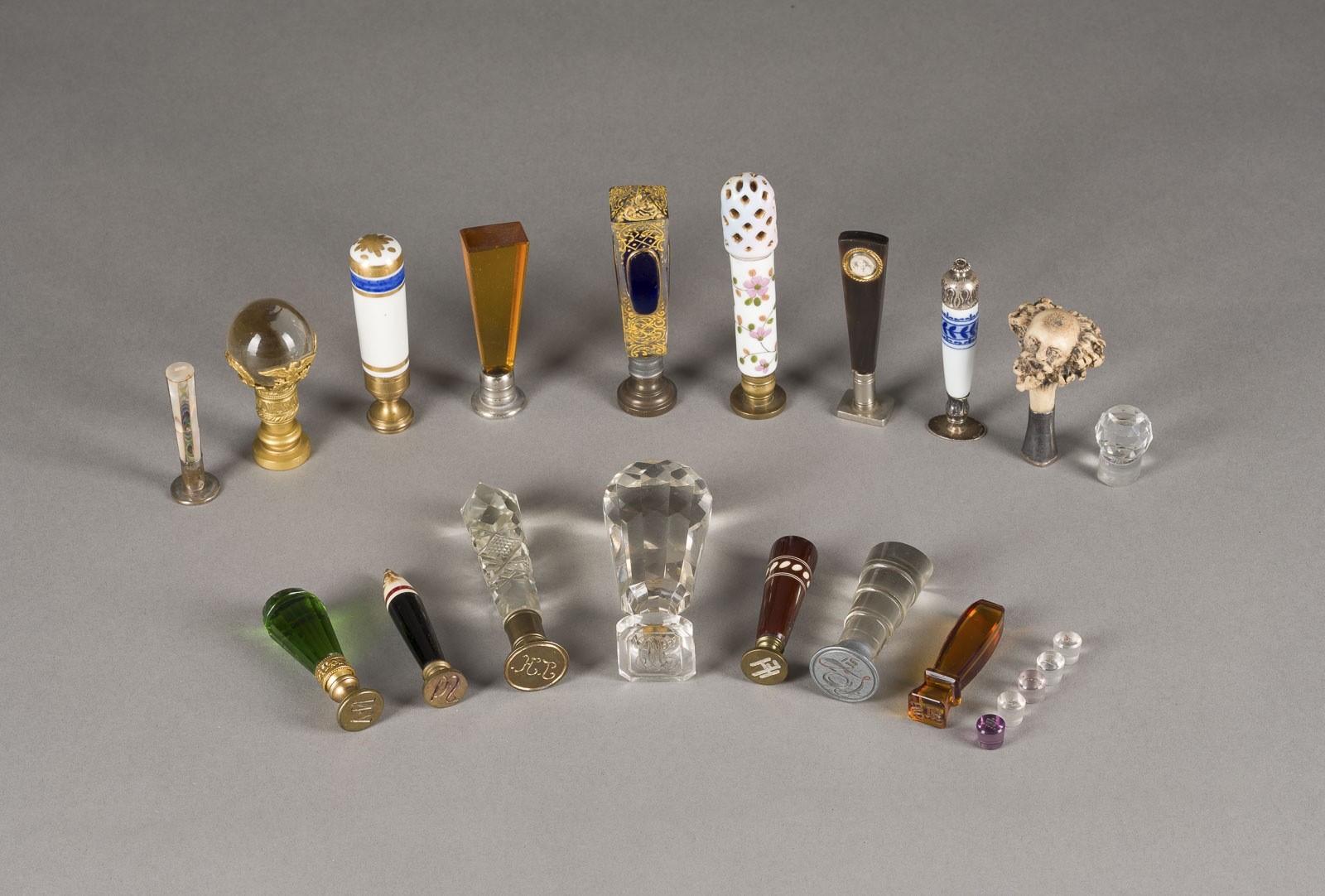 COLLECTION OF 22 SEALS Various origins and periods Various materials such as glass, porcelain, bone, mother-of-pearl, and various metals. Max. length 10 cm, min. length 1 cm. Various monograms. Partially damaged.