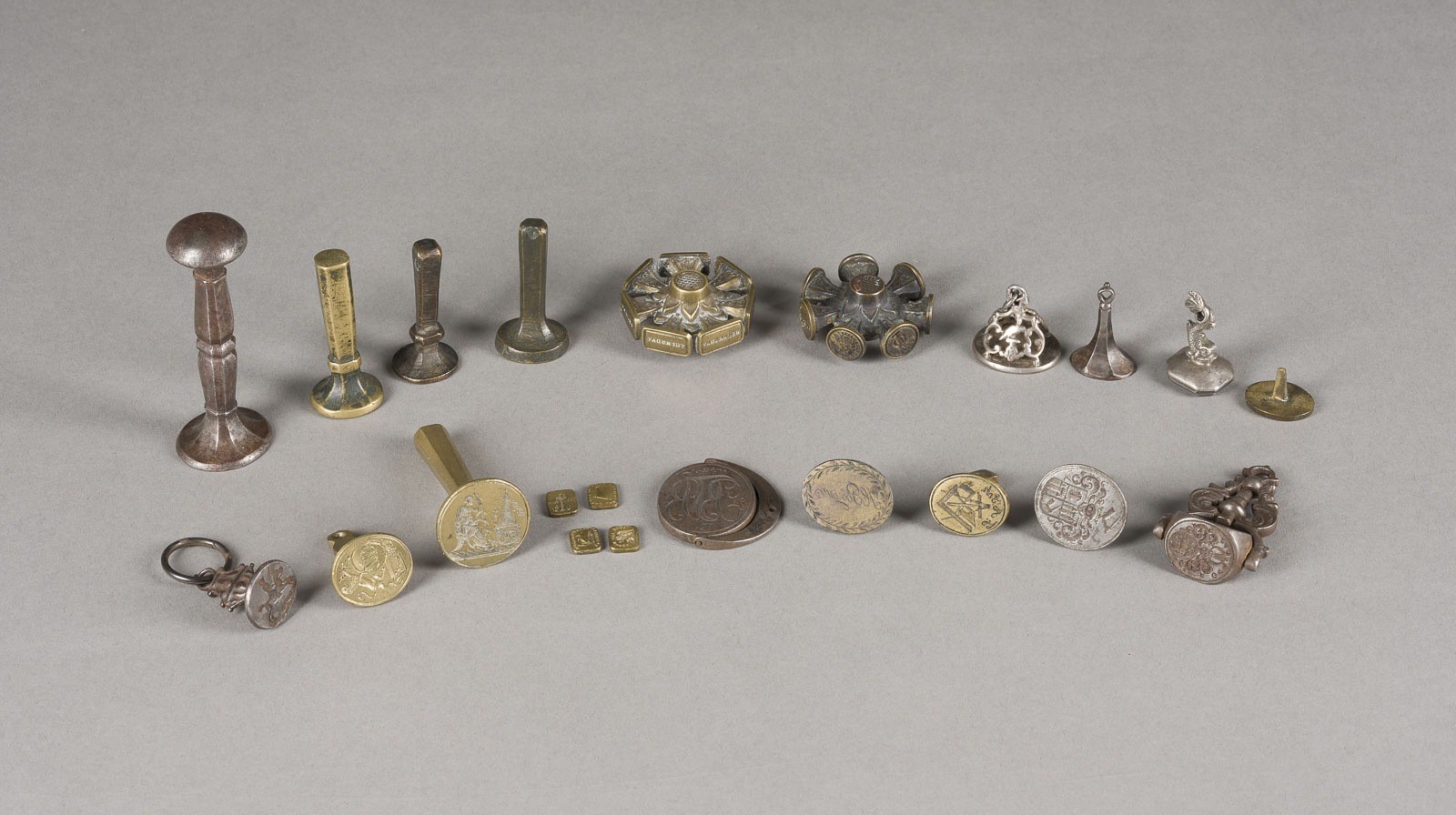 COLLECTION OF 22 SEALS Various origins and periods Various metals. Max. length 7.5 cm, min. 0.2 x 1 x 0.7 cm. Various designs and monograms. Partially damaged.