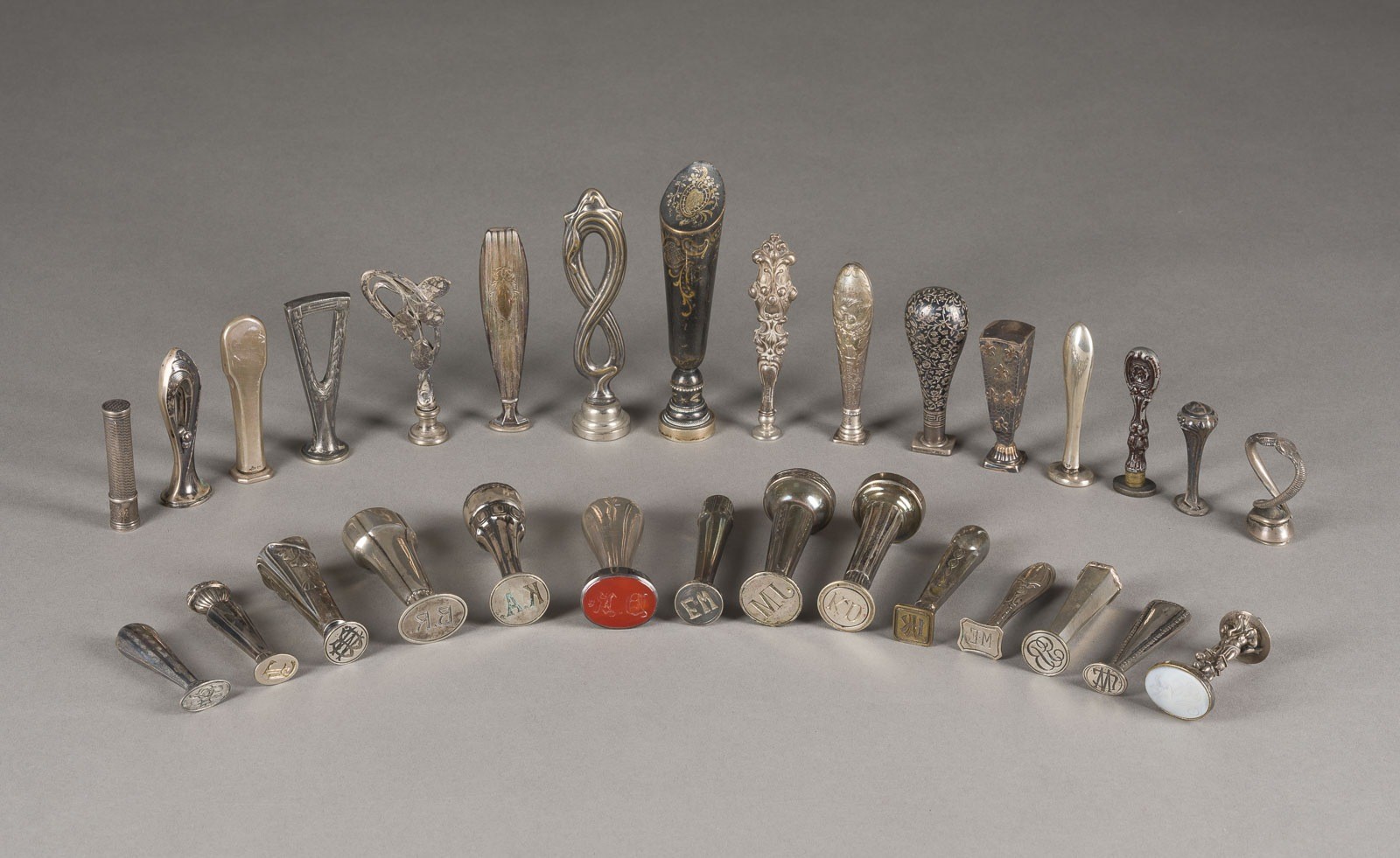 COLLECTION OF 30 SEALS Various origins and periods Various metals, silver and silver-plated. Max. length 11.5 cm, min. length 4.5 cm. Some are stamped. Various designs and monograms. Partially damaged.