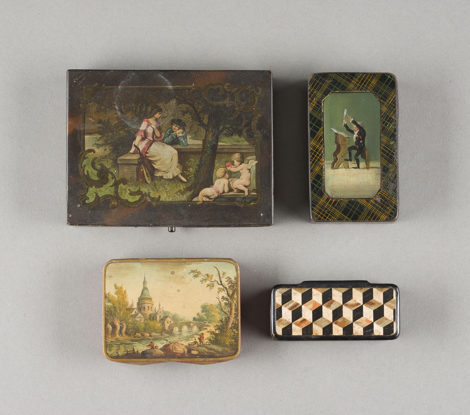 LOT OF 4 METAL AND LACQUERED BOXES 19th century Papier-mâché, black lacquered, polychrome painted, metal. Max. 2 x 13.5 x 10 cm, min. 2 x 8 x 3.5 cm. Various shapes with landscape, figurative, and geometric decoration on the lids. Partially damaged.