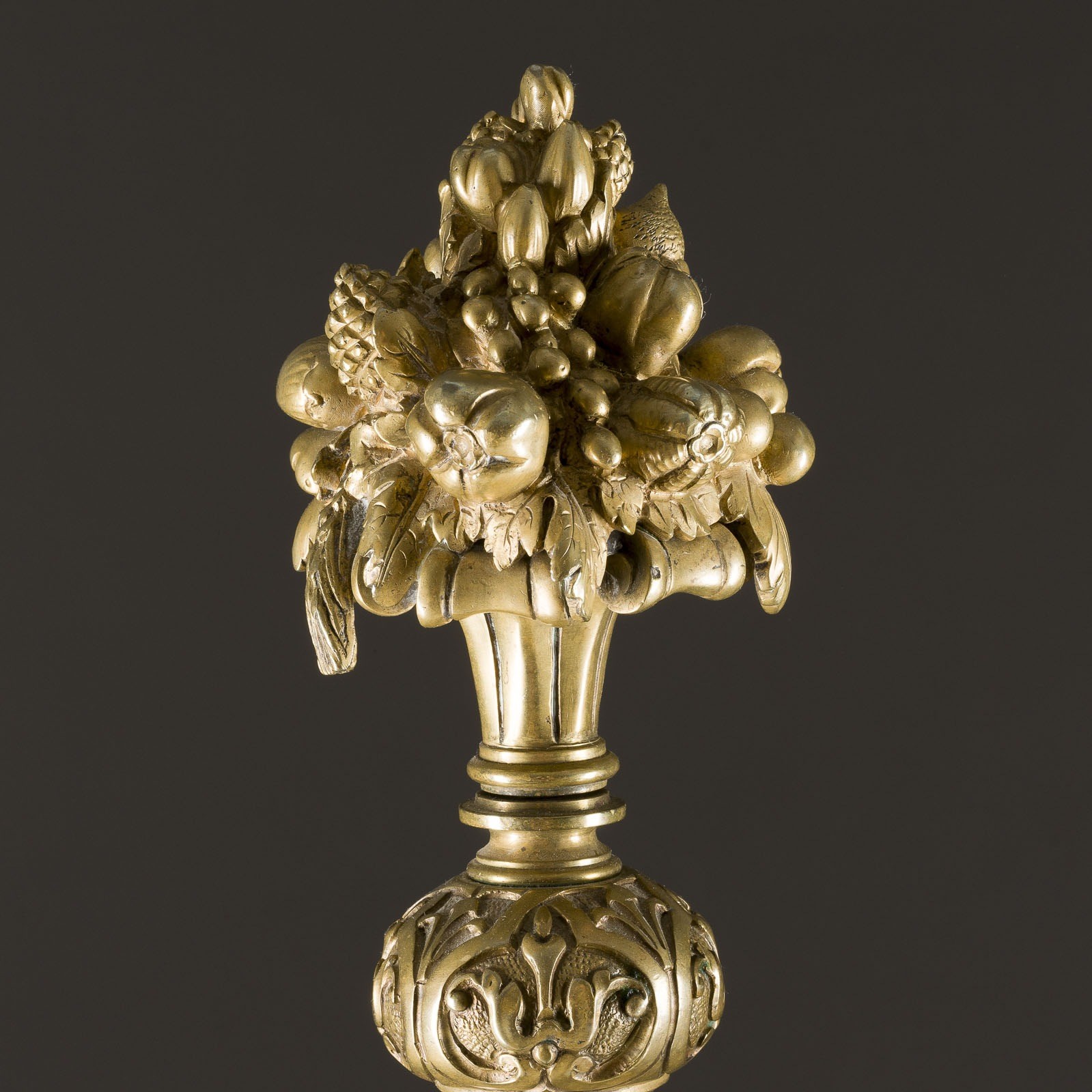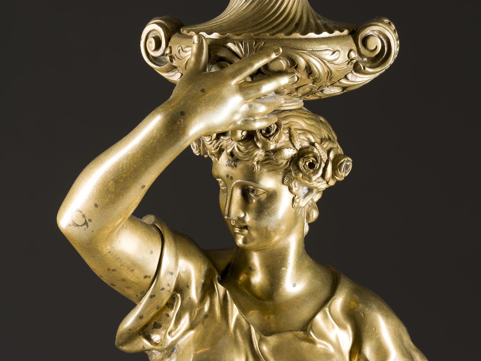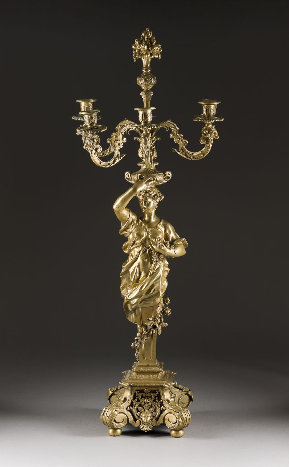 MONUMENTAL FLOOR GIRANDOLE 19th century Bronze. 108 x 40 x 21 cm. Floral and mask-decorated base. Five-light candelabra supported by a herm, with curved arms, ram's heads, and a central floral bouquet. Signs of wear.
