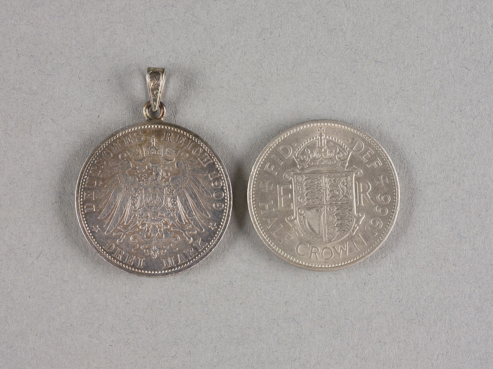 COIN PENDANT OF WILHELM II (1909) AND ELIZABETH II HALF-CROWN COIN (1966) German, circa 1909 and Great Britain, circa 1966 Silver respectively copper-nickel. Diameter 3 cm. A 1909 German Empire three-mark coin with a profile portrait of Kaiser Wilhelm II of Prussia and a suspension loop, and a 1966 half-crown coin with a laurel-wreathed profile portrait of Elizabeth II and the inscription 'ELIZABETH II DEI GRATIA REGINA'. Partially chipped.