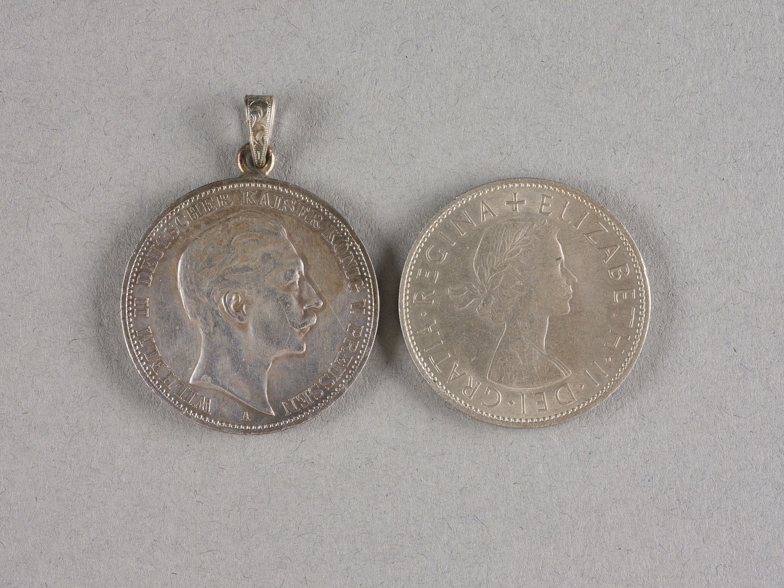 MÜNZANHÄNGER WILHELM II. (1909) UND HALF-CROWN-MÜNZE ELIZABETH II. (1966)