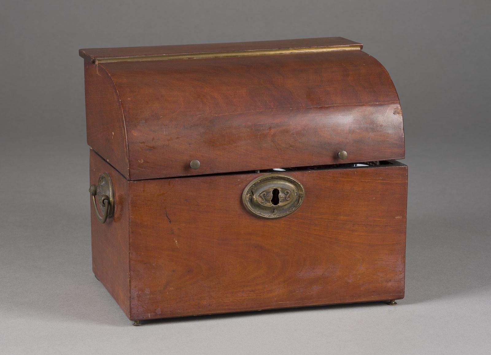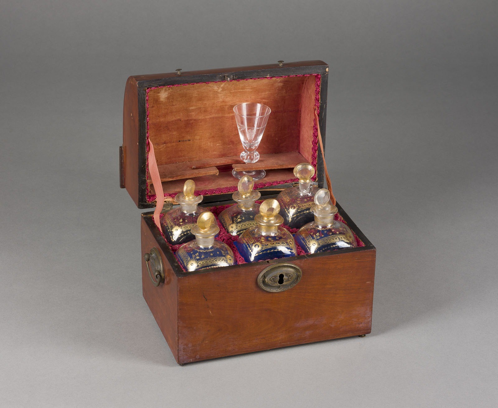 TRAVEL BAR - LIQUEUR CAVE * England, 19th century Mahogany, veneered, bronze, glass, textile. 21 x 25.5 x 17 cm. Rectangular box with a hinged, domed lid. Side handles. Inside, six compartments with gold-ornamented bottles and a glass (secondary) in a holder in the lid. Damaged; no key. Due to current CITES regulations, unrestricted trade in mahogany objects is only permitted within the European Union. Export to third countries is not possible.
