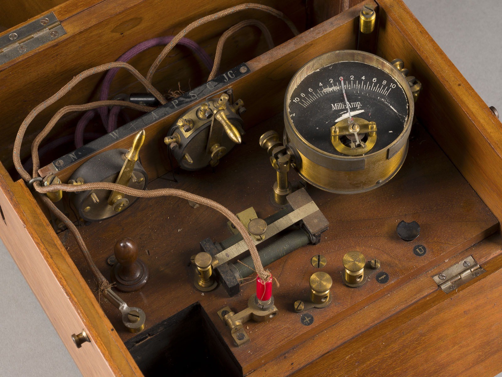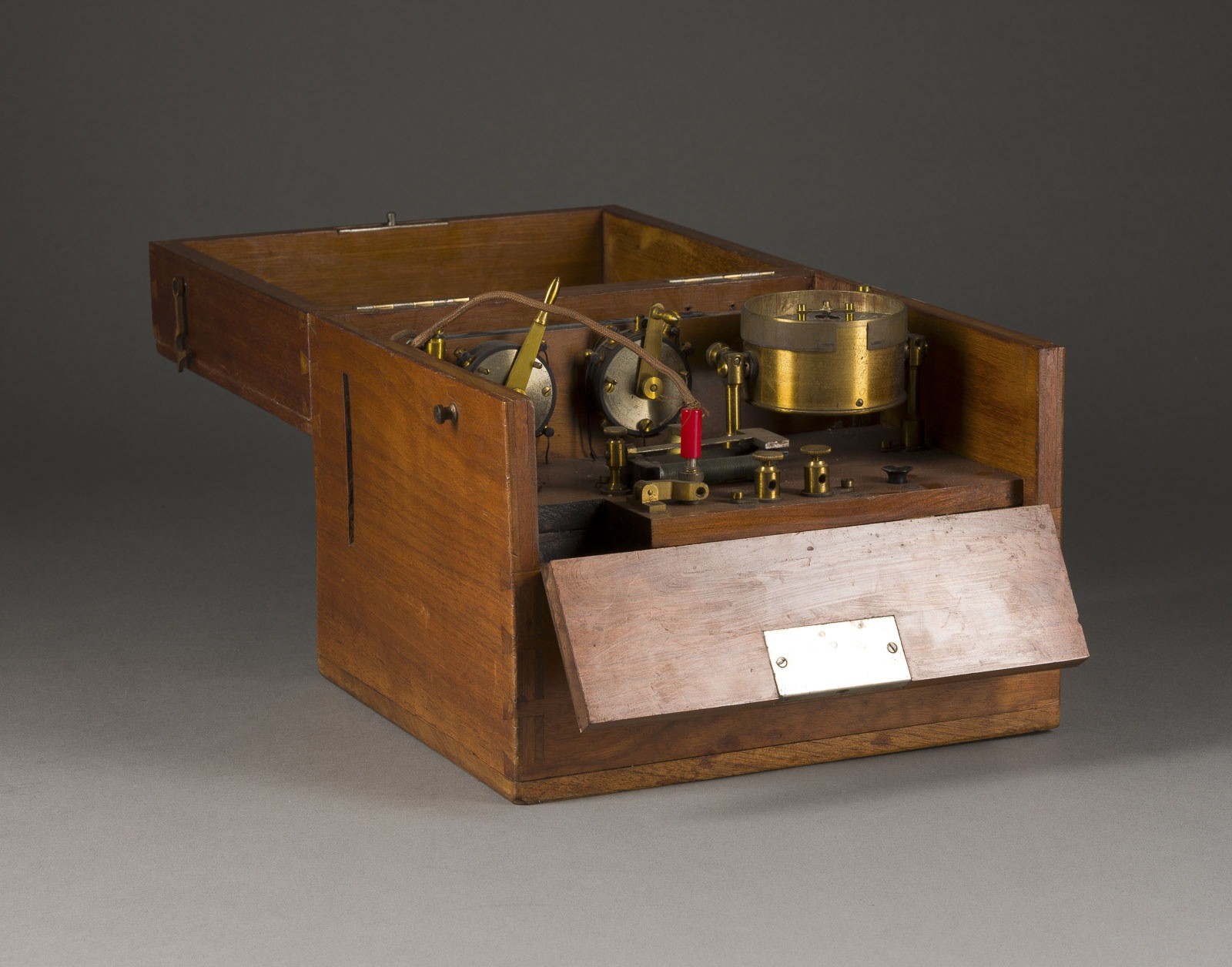 ELECTROTHERAPY DEVICE Early 20th century Various metals, in original wooden box. 21 x 23.5 x 21 cm. Signs of wear, some damage, function untested.