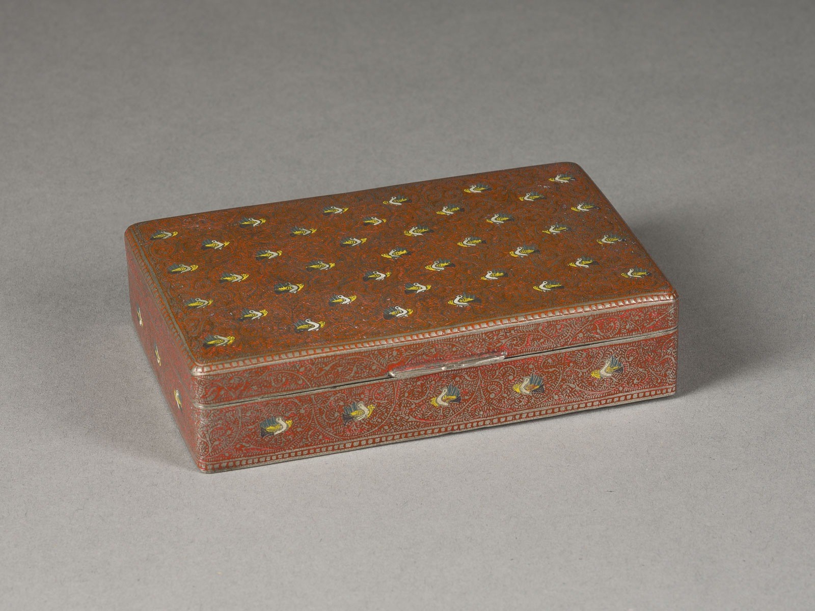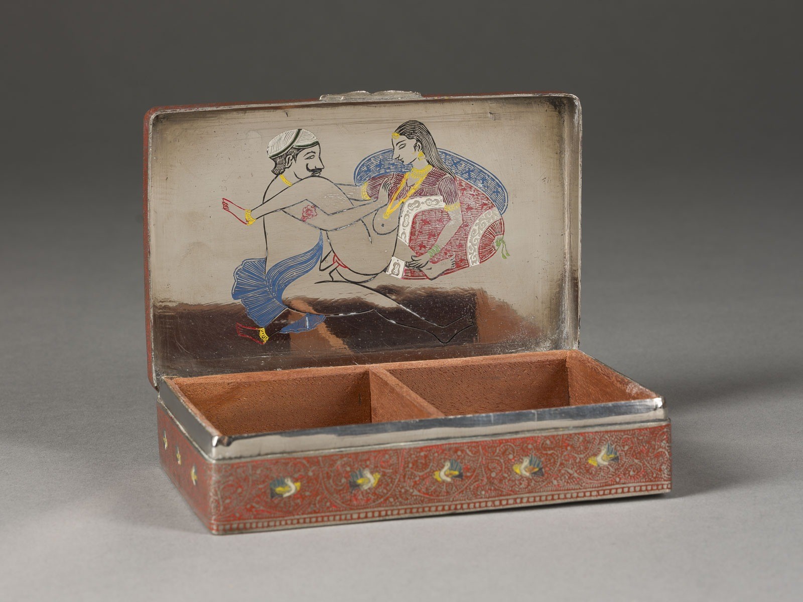 BOX WITH KAMA SUTRA SCENE India, circa 1900 Brass, chrome-plated, engraved and partially polychrome decorated, wood. 3.5 x 13 x 8.5 cm. Rectangular box with hinged lid and fine, contrasting engraved decoration of vines and birds. Interior with wooden compartments and the inside of the lid with an engraved Kama Sutra scene. Partially worn, scratched.