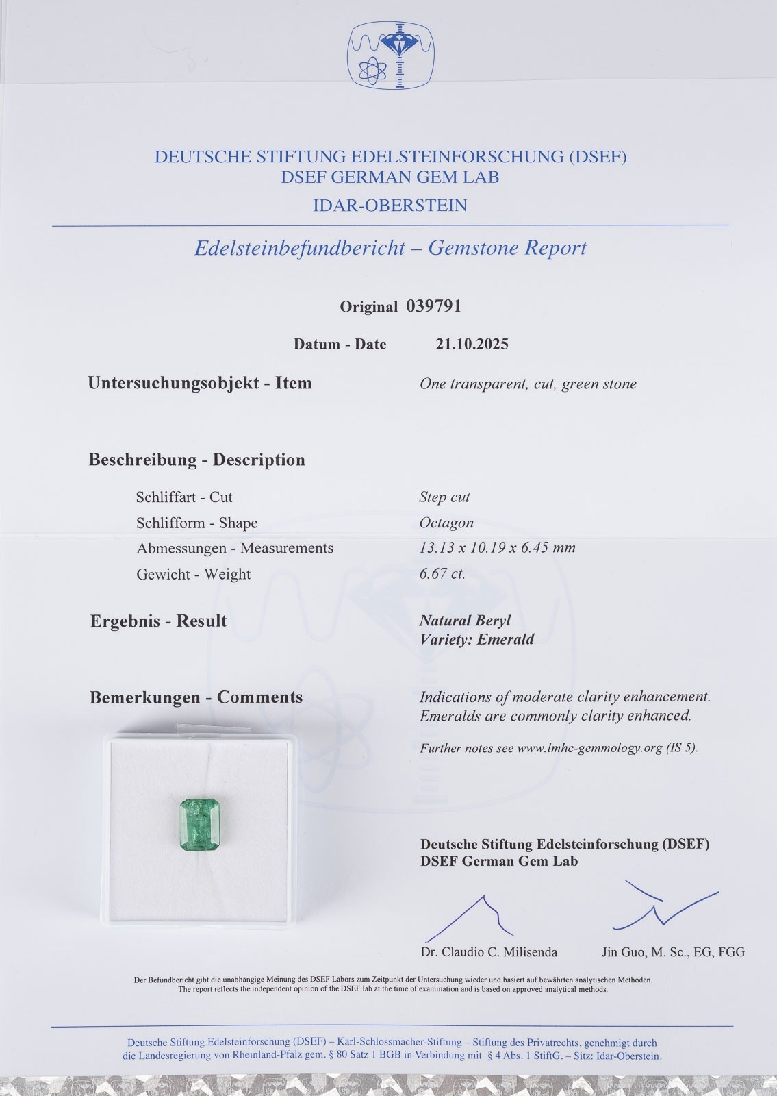 Expertise: inkl. DESF Zertifikat aus Idar-Oberstein von 2025.