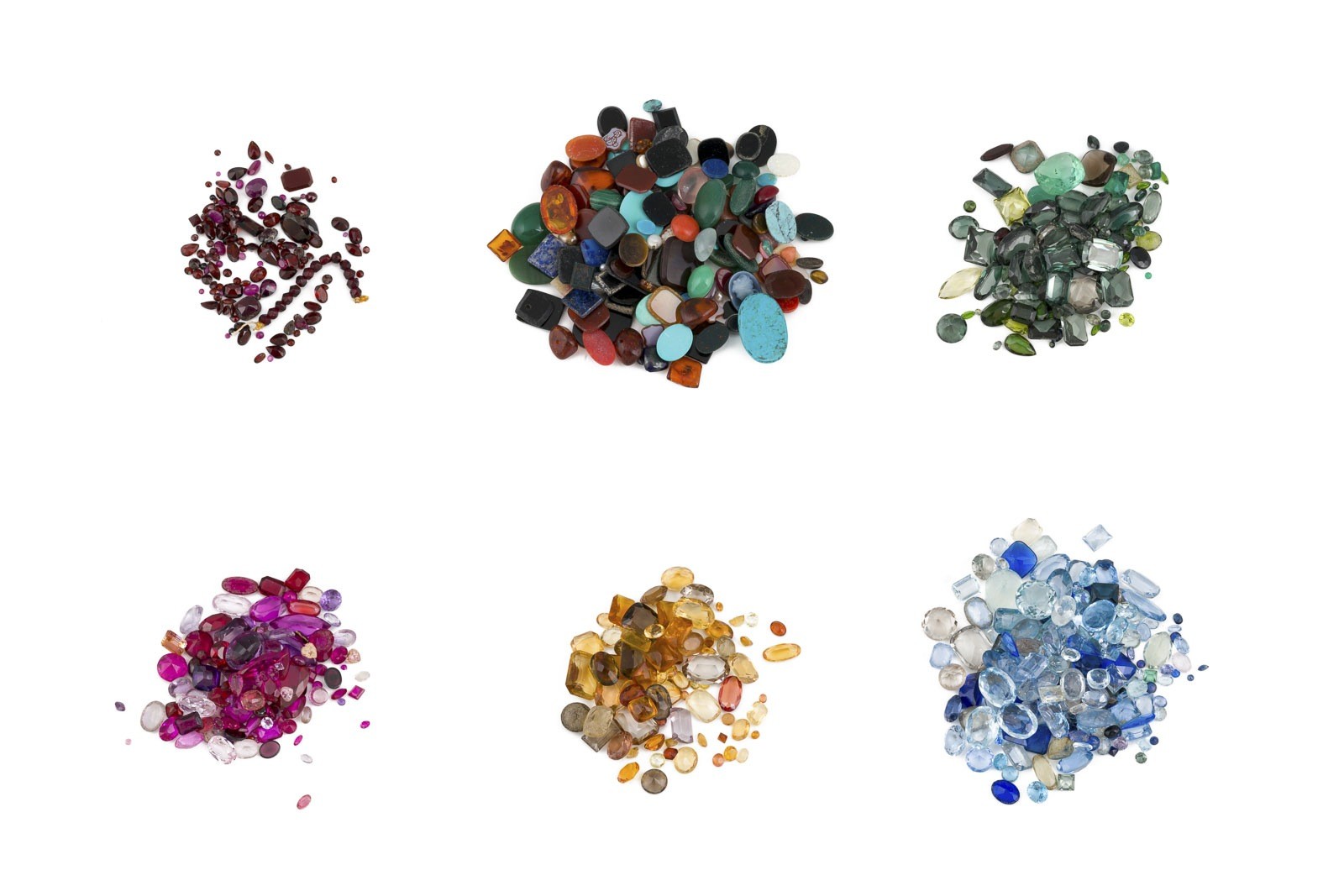 GROßES KONVOLUT AN EDELSTEINEN Ges.-Gew.: ca. 616,0 g (inkl. Tüten und Verpackung). Großes Konvolut an Edelsteinen. Unter anderem: Rubine, Granate, Kameen und Gemmen, Onyx,