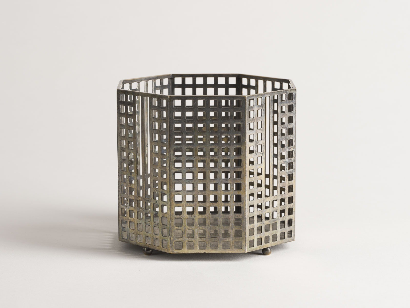 WIENER WERKSTÄTTE (IN THE STYLE OF) GRID BASKET probably Austria Nickel-plated brass. H. 11,3 cm, W. max. 13,5 cm, D. 12,5 cm. Three indistinct marks 'JH' 'WW' 'Rose mark' (hallmarked). Octagonal basket on ball feet. Signs of use.