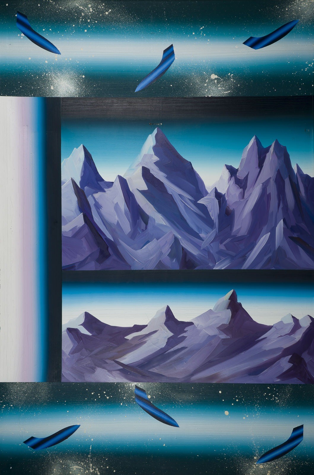 VERA LEUTLOFF 1962 Hamburg - lives and works in Düsseldorf ALPS (1991) Oil on canvas. 150 x 100 cm. Verso: signed, dated and inscr. '55' on the reverse. 1981-1989 studies at Kunstakademie Düsseldorf under Prof. Alfonso Hüppi, master studen. Part. with pressure marks, part. rubbed., part. with craquelure, part. with colour loss. Provenance: Rhenish private collection.