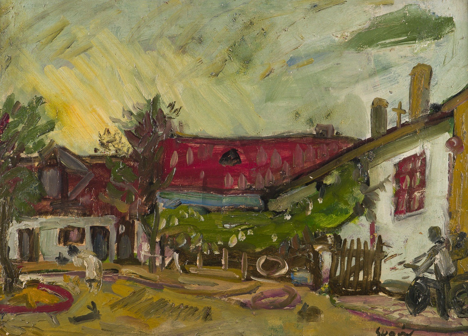 ANDOR SUGAR 1903 Budapest, Hungary - 1944 ? VILLAGE SQUARE Oil on hardboard. Frame dimensions 42.8 x 57 cm. Hardboard 34.5 x 48.5 cm. Signed at lower right 'Sugár'. Inscribed on the verso. Partially slightly soiled. Framed. Provenance: Bergisch private collection.