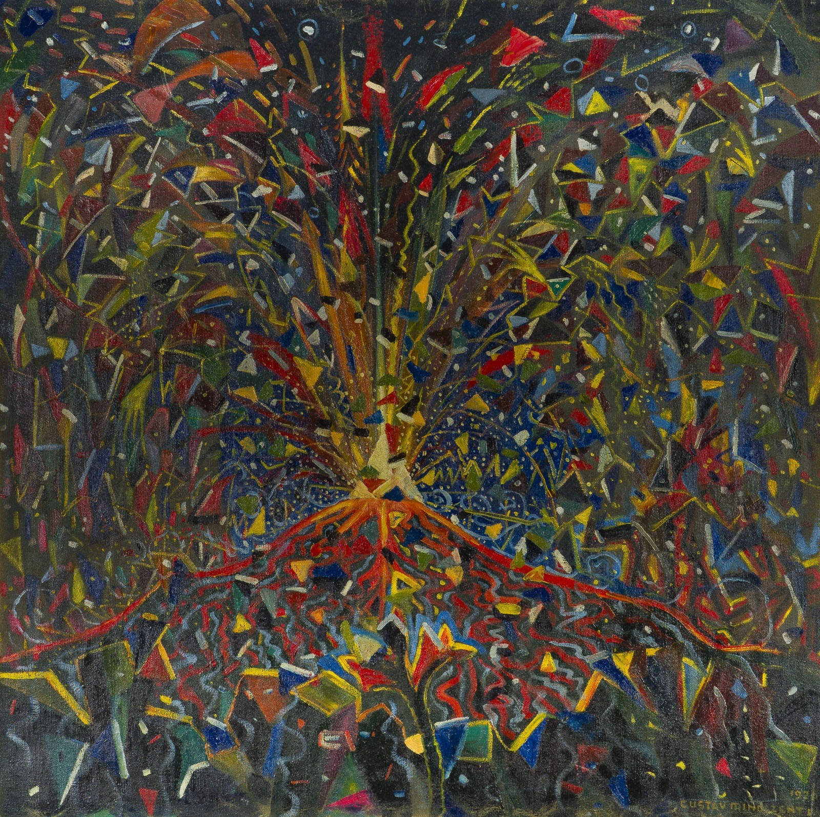 GUSTAV AUREL MINDSZENTI Wien 1892 - 1965 EXPRESSIVE VOLCANIC ERUPTION (1920) Oil on canvas, doubl. at the edges, newly mounted. 100,5 x 101 cm. Signed and dated lower right. Verso: Remnants of an old label on the reverse. Slightly worn at the edges. Gustav Aurel Mindszenti (1892-1965) was an Austrian filmmaker who worked internationally in various areas of film production. After starting out as a draughtsman at Wiener Film in 1918, he worked as a director, screenwriter and film architect. In the 1920s and 1930s, he was active in Austria, Germany and Great Britain, directing Helden des Alltags (Heroes of Everyday Life, 1923) and A Royal Demand (1933), among others. After returning to Vienna, he worked briefly for Wien-Film before emigrating to South Africa after the Second World War. He was last active in film there in 1947. Little is known about the rest of his life; he died in Vienna in 1965.