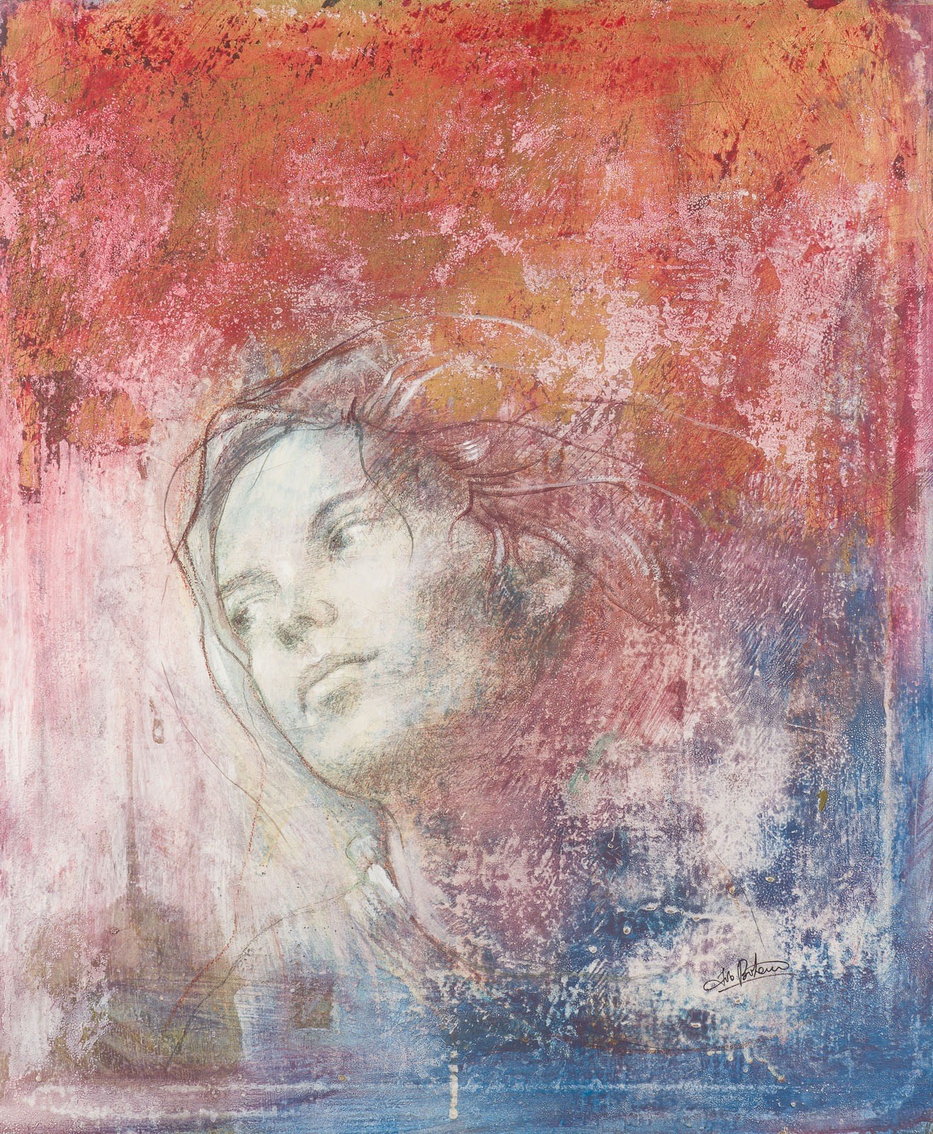IVO BATOCCO 1944 Cingoli, Italia PORTRAIT OF A GIRL Mixed media with oil and gouache on canvas with gold pigment. 60 x 50 cm. Signed lower right. Spot with small loss of colour in the lower right corner. Unframed. Provenance: Private collection in the Lower Rhine region.