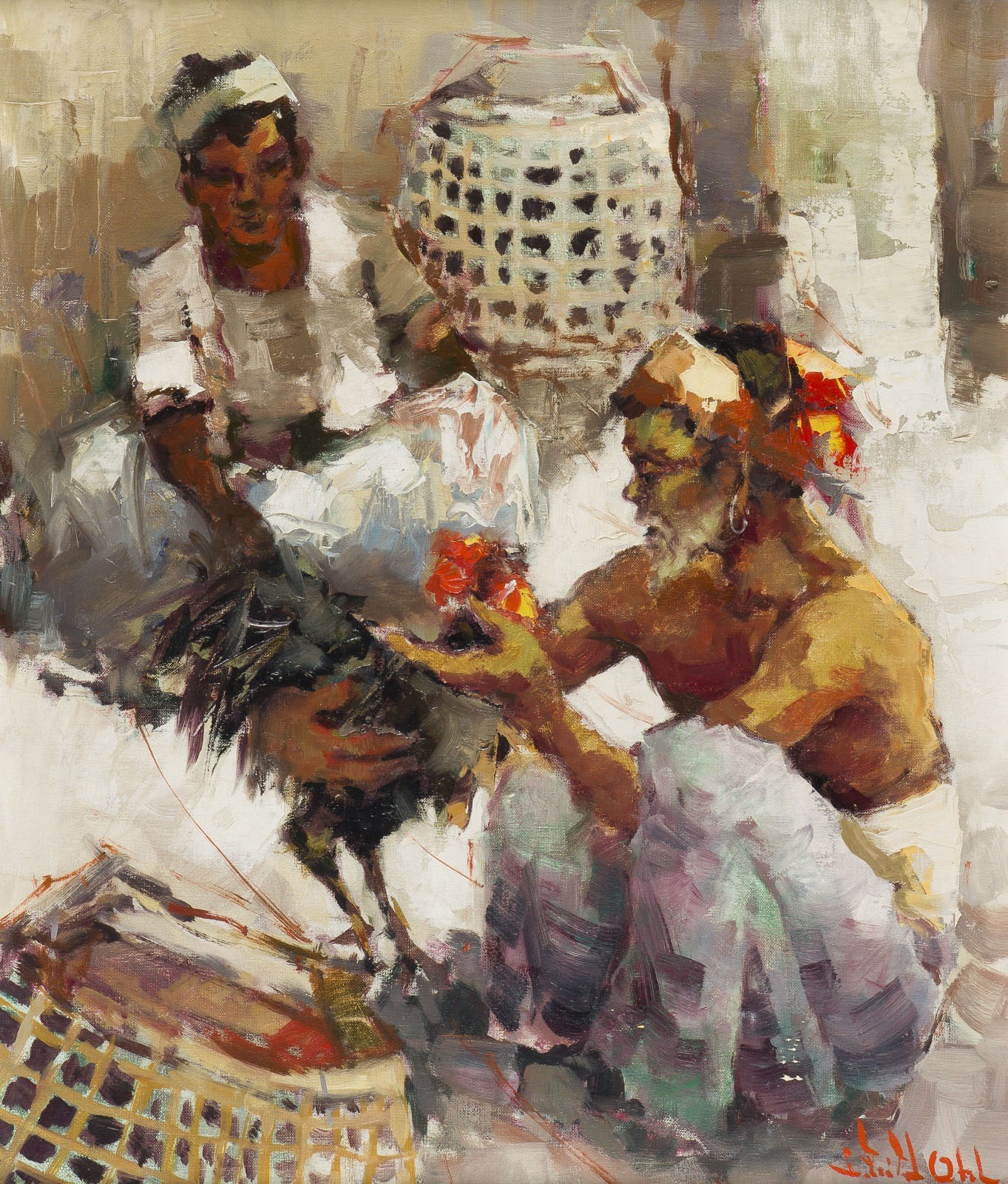FRITS LUCIEN N. OHL 1904 Palembang, Sumatra, Indonesia - 1976 Den Haag MARKET SCENE WITH ROOSTER Oil on canvas. Frame size 75 x 65 cm. Canvas 60 x 50 cm. Signed lower right. Unten rechts sign. Inscribed by an unknown hand on the stretcher and the frame on the verso. Framed.