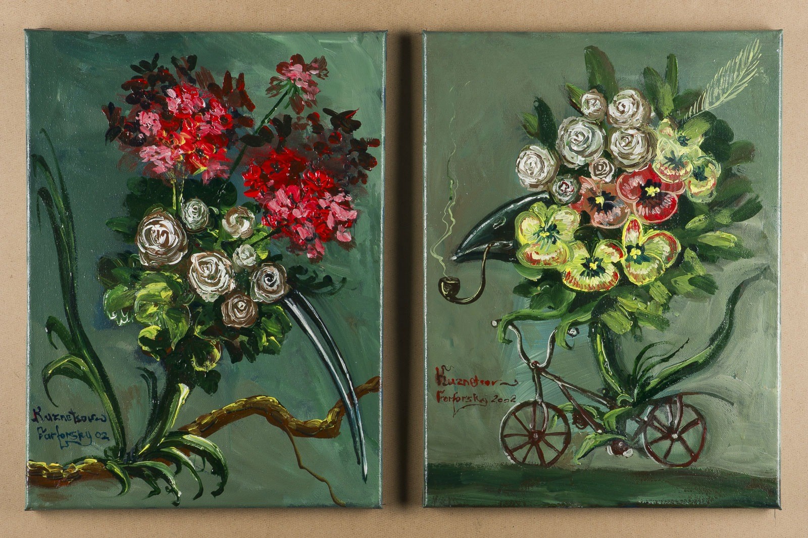 DMITRY KUZNETSOV-FARFORSKY 1972 Kataysk, Russia 'MORGENDLICHE RADTOUR (MORNING BIKE RIDE)' AND 'FRAU KOLIBRI (MRS KOLIBRI)' (2002) from: Serie - Blumen - Vogel. Transkriptionen. Übergang (Series - Flowers - Bird. Transcriptions. Transition) Acrylic on canvas. Frame dimensions 63 x 83 cm. Canvas each 40 x 30 cm. Each signed and dated lower left as well as signed, dated, inscribed and titled on the verso. As an addition: Catalogue of works of the artist 'Kuznetsov-Farforsky. Ich lebe mein viertes Leben', 2025. Framed as a pair of two paintings in one frame. Provenance: Private collection.