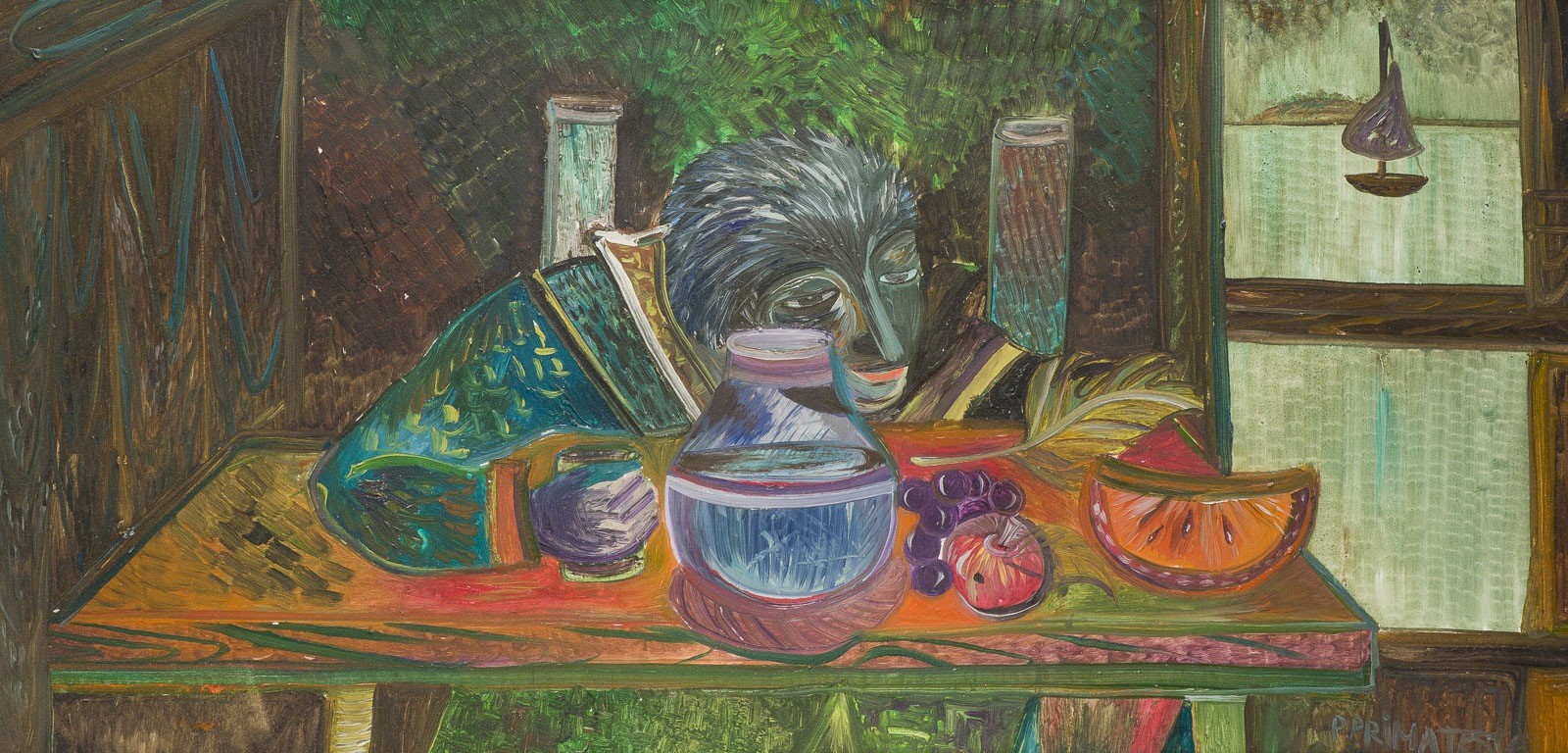PAOLO PRIMATESTA 1973 Nonio, Italy PORTRAIT WITH STILL LIFE Oil on canvas. F 67 x 117 cm, canvas 50 x 100 cm. Signed lower right 'Primatesta'. Frame. Provenance: Private collection, Lower Rhine.