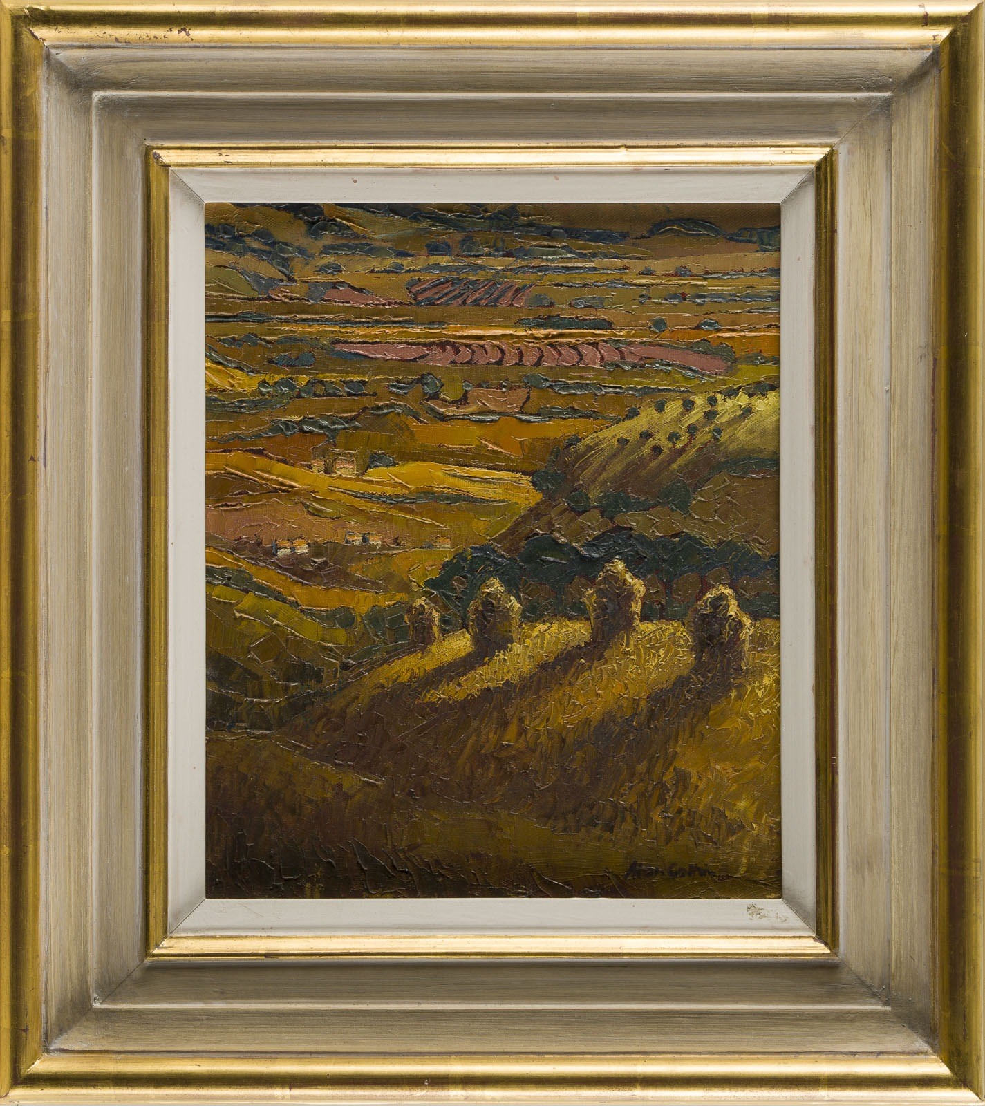 ALAN COTTON 1938 Redditch, GB 'PROVENCE - HARVEST FIELDS IN LATE EVENING LIGHT' Oil on canvas. Frame size 46 x 41 cm. Canvas 31 x 25.5 cm. Signed lower right. Inscribed and titled on the stretcher on the verso as well as with old adhesive label of an exhibition. Framed.