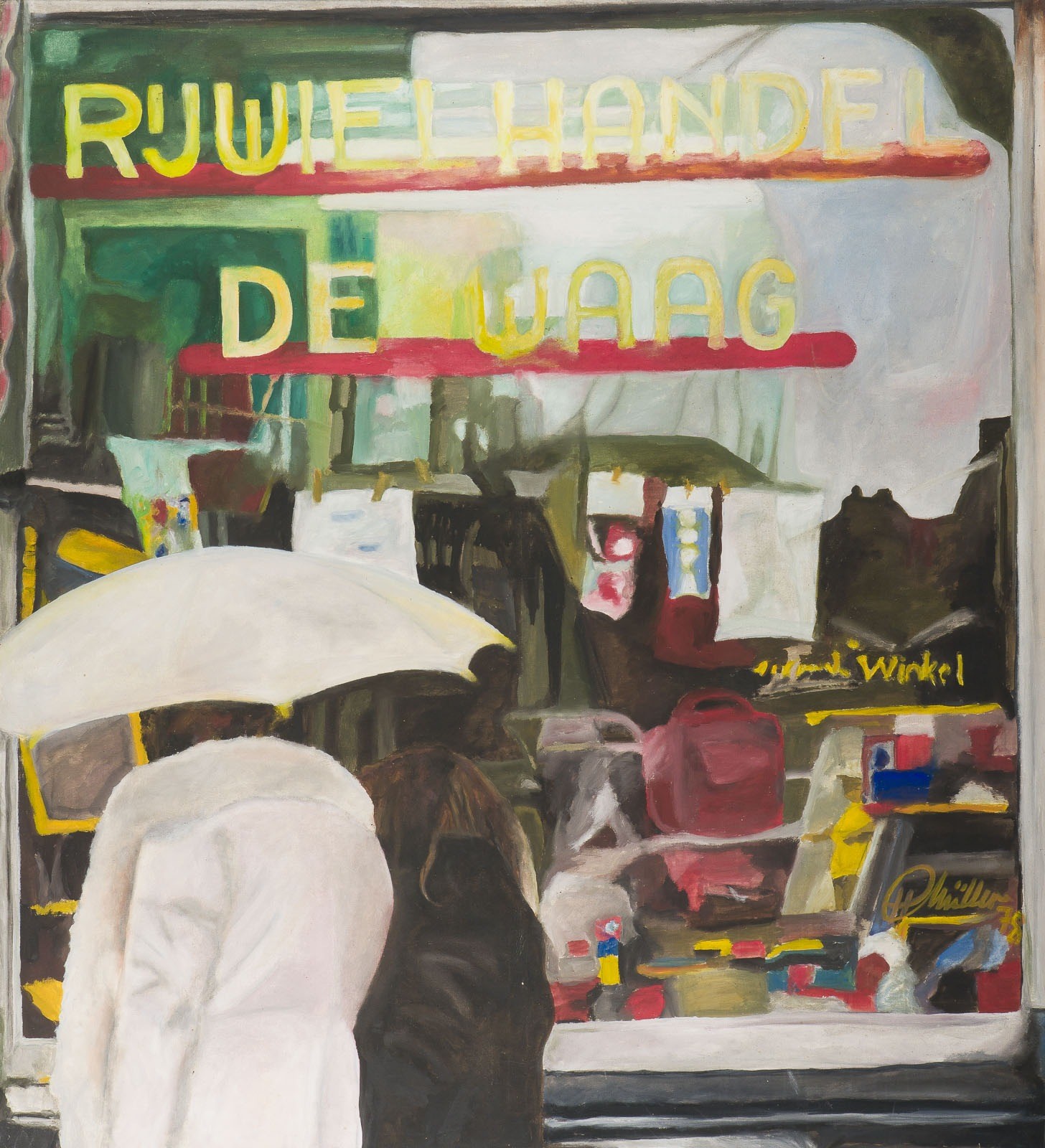 HANS-PETER MÜLLER 1949 Kiel WINDOW SHOPPING (1978) Oil on canvas. Frame dimensions 121.5 x 111.5 cm. Canvas 120 x 110 cm. Signed and dated at lower right 'HPMüller (19)78'. Partially slightly soiled. Framed.