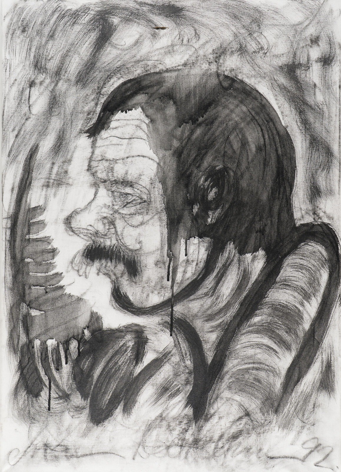 ANTONIUS HÖCKELMANN 1937 Oelde - 2000 Cologne 'SELF' (1992) Mixed media, oil and charcoal on canvas. 70 x 50 cm. Signed and dated lower centre 'Antonius Höckelmann 92'. Verso: signed, dated and titled on the reverse. 2,5 cm long tear under the upper stretcher frame, canvas slightly wavy in the lower corners. Provenance: Private collection Baden-Württemberg.