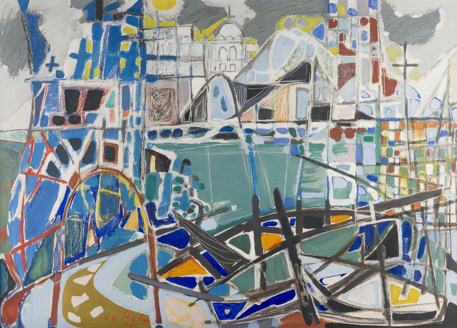 MODERNER KÜNSTLER Active mid. 20th century VIEW OF THE HARBOUR AND THE CITY (1959) Mixed media on canvas. Frame size 72.5 x 96 cm. Canvas 84.5 x 60 cm. Illegibly signed and dated '(19)59.' at the left bottom. With stamp of the canvas manufacturer 'A. SCHUTZMANN VIKTORIA MALLEINEN' on the verso. Framed.