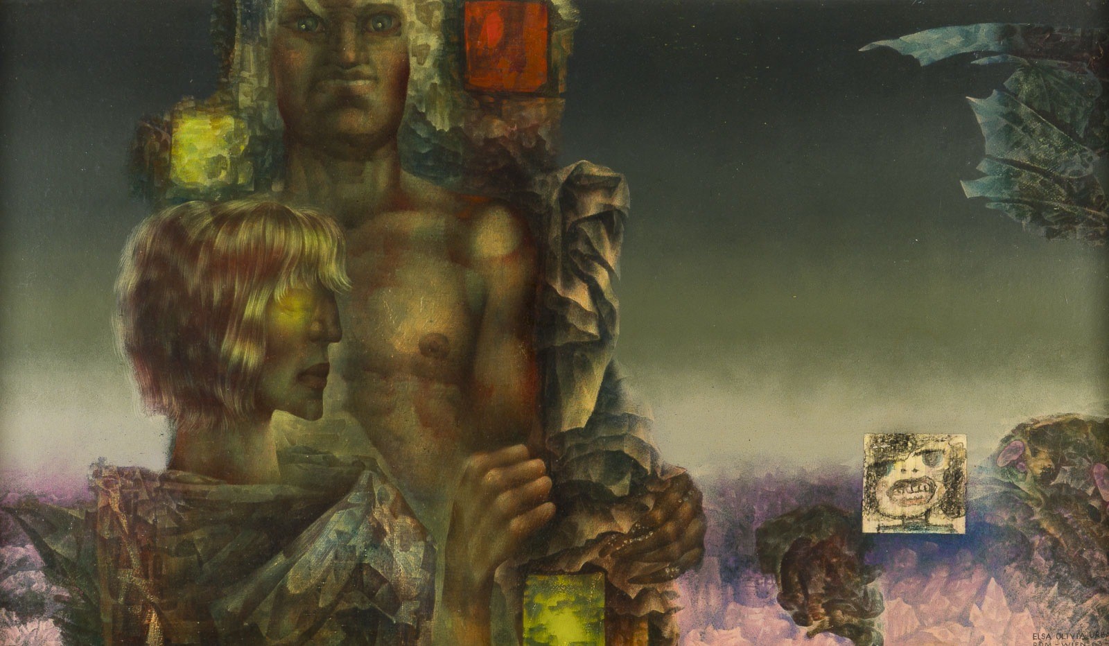 ELSA OLIVIA URBACH 1935 Vienna TWO FIGURES IN A FANTASTIC LANDSCAPE (1963/64) Oil on panel. Frame size 89.1 x 119.3 cm. Visible size 38.6 x 68.5 cm. Signed, dated and located 'ELSA OLIVIA URBACH ROM - WIEN 63-64' lower right. Inscribed on artist's adhesive label on the verso. Very slight craquelure. Framed. Provenance: According to an adhesive label on the verso formerly 'Privateigentum: Dr. A. Muchna'.