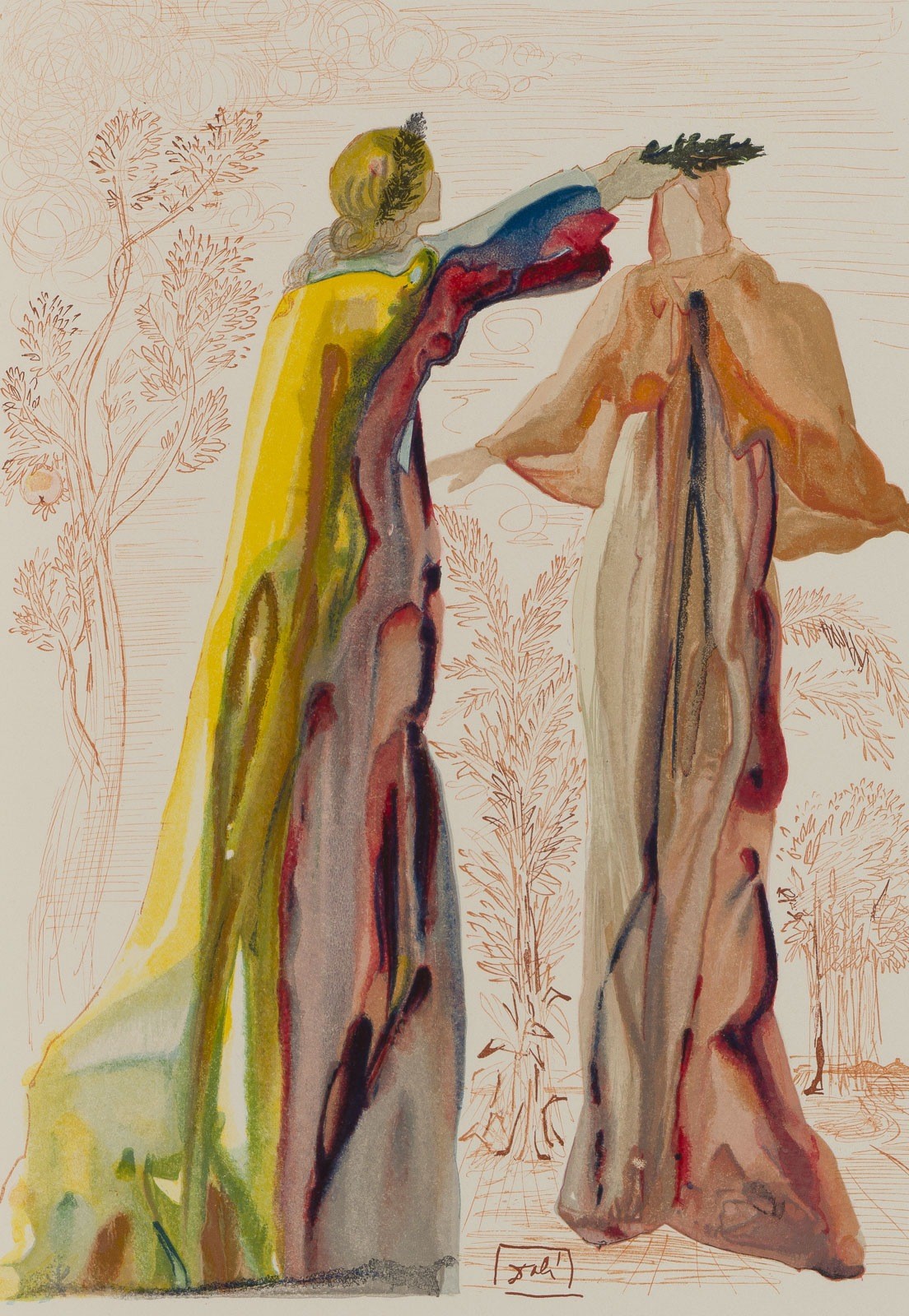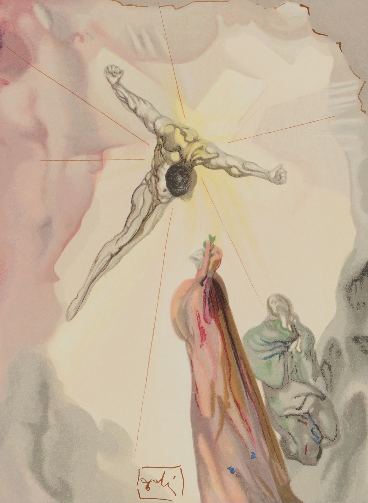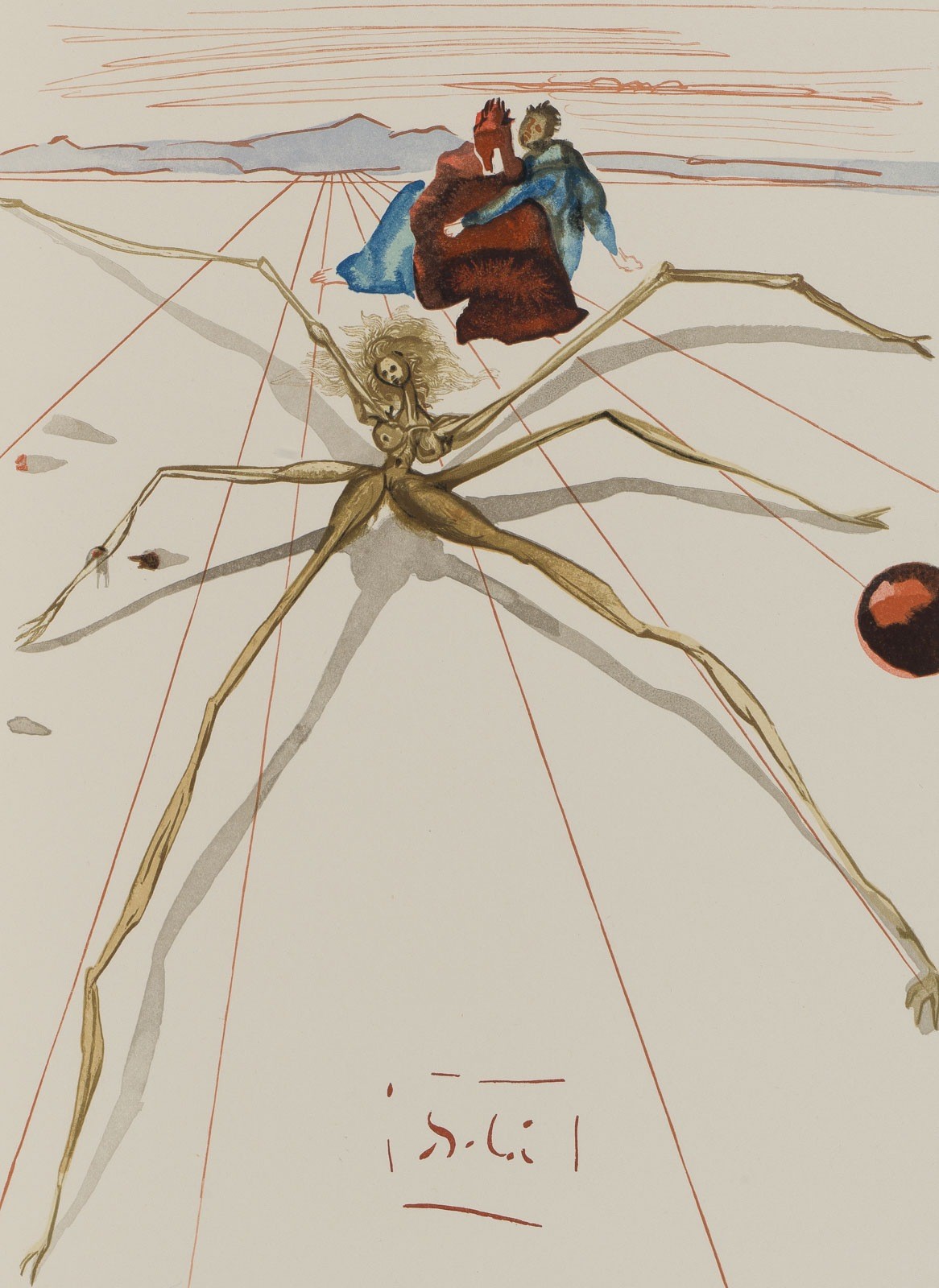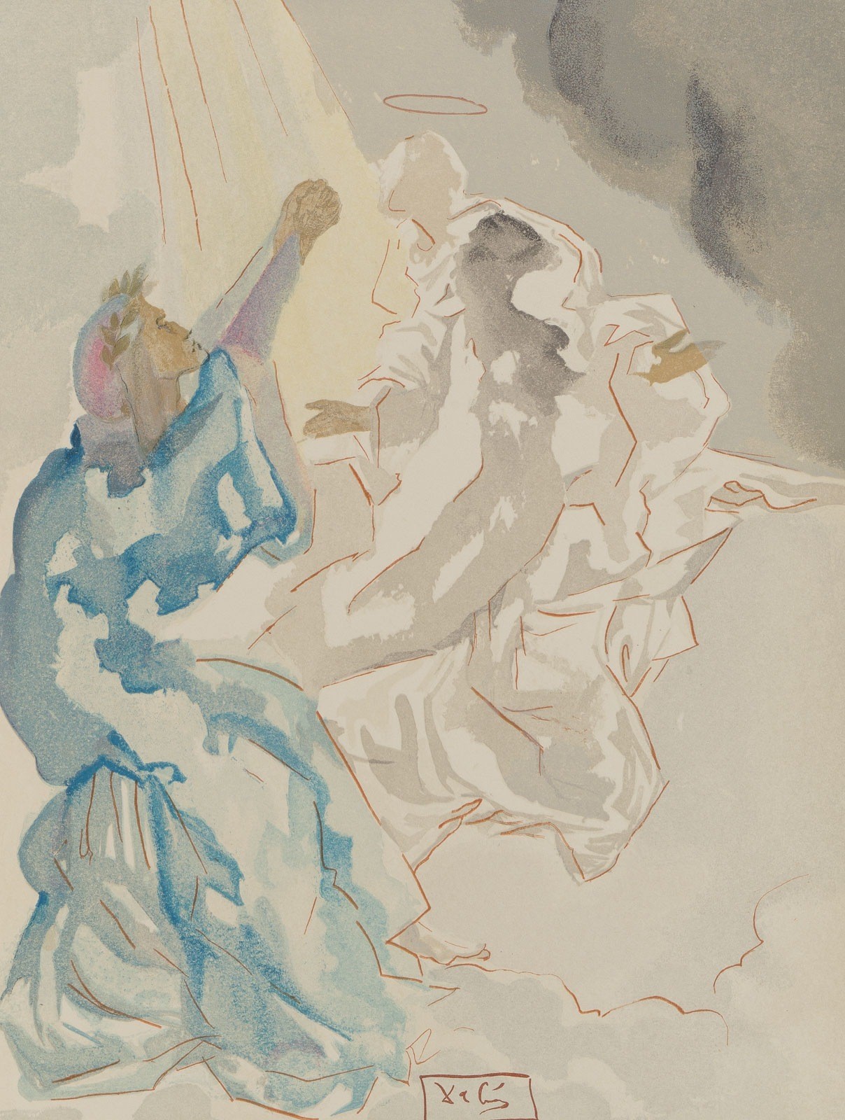 SALVADOR DALI 1904 Figueres, Girona - 1989 ibidem 40 SHEETS FROM THE PORTFOLIO: 'LA DIVINE COMÉDIE (THE DIVINE COMEDY)' (1960) 40 Farbxylographs on wove paper, in original brochure and box with linen cover and spine titel 'Salvador DALI'. Box 45 x 34.5 x 6 cm, Sheet dimensions each 33 x 26.2 cm. Each signed in print 'Dalí'. The collection contains the sheets 51-100 with the exception of the following: 6, 73-76, 88-89 as well as 96-98. Loose sheets in passe-partout as loose sheets in brochure. Literature: Michler/Löpsinger 1039-1138. Provenance: Renowned private collection North-Rhine Westphalia; previous owner belonged to the artist's close circle.