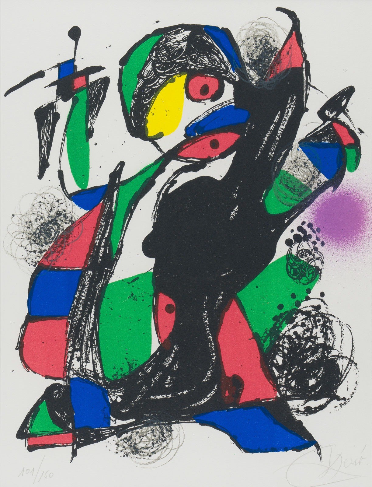 JOAN MIRO 1893 Barcelona - 1983 Calamajor (Mallorca) SHEET FROM 'JOAN MIRO LITHOGRAPHS IV' (1975) Colour lithograph on Arches, from the deluxe edition of 150 copies. F 65 x 55 cm. Visible size 33 x 25 cm, sheet size 33,3 x 24,9 cm. Signed in pencil lower right and num. lower left '101/150'. Framed behind glass in gallery frame. Provenance: Rhenish private collection.