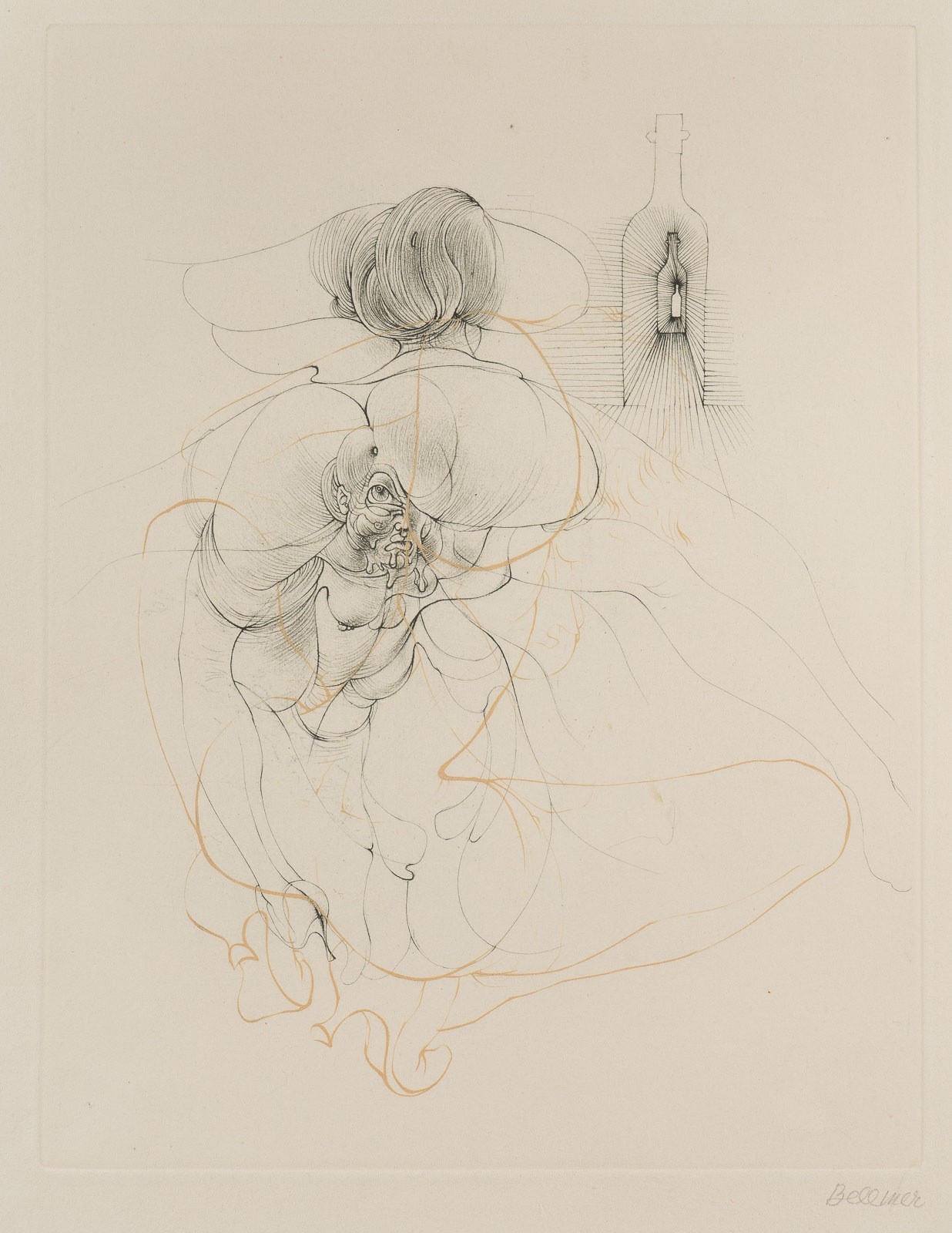 HANS BELLMER 1902 Kattowitz - 1975 Paris SHEET FROM 'LE PETIT TRAITÉ DE MORALE' (1968) Colour etching on laid paper. Sheet dimensions 37.6 x 28.3 cm. Print size 27.6 x 21.1 cm. Signed in pencil at lower right 'Bellmer'. Inscribed in pencil by an unknown hand on the verso as well as with remnants of an old mounting. Partially with very slight foxing and two pinholes. Unframed.