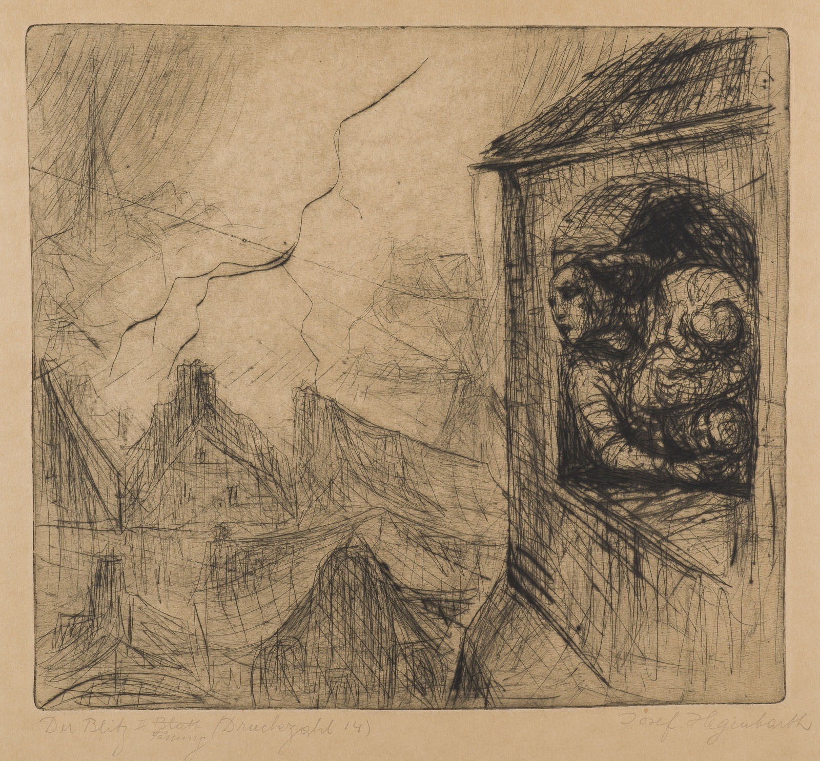 JOSEF HEGENBARTH 1884 Böhmisch-Kamnitz - 1962 Dresden 'DER BLITZ (THE LIGHTNING)' Etching on paper. Sheet dimensions 44.2 x 34.4 cm. Print size 25.7 x 28.4 cm. Signed in pencil at lower right as well as titled and inscribed 'II. Blatt-Fassung (Druckzahl 14)' at lower left. Inscribed by an unknown hand in pencil as well as with remnants of an old mounting. Irregularly browned. Unframed.