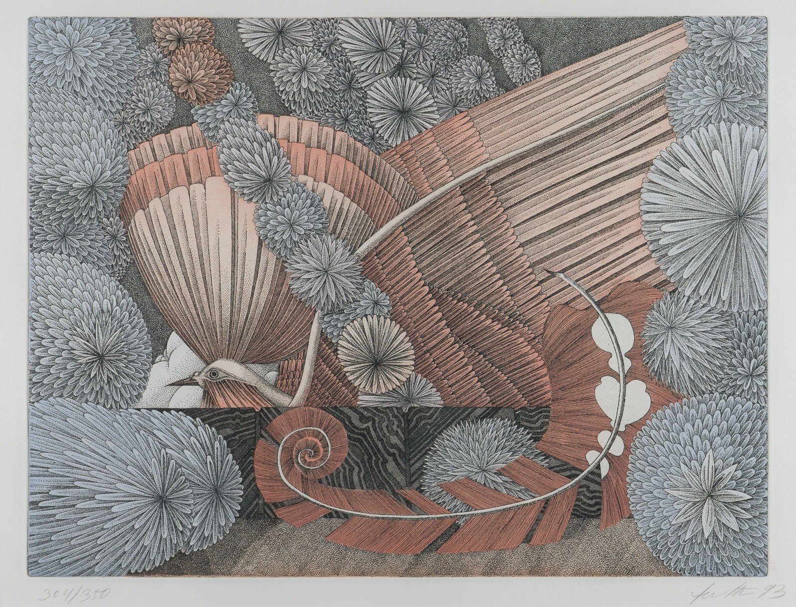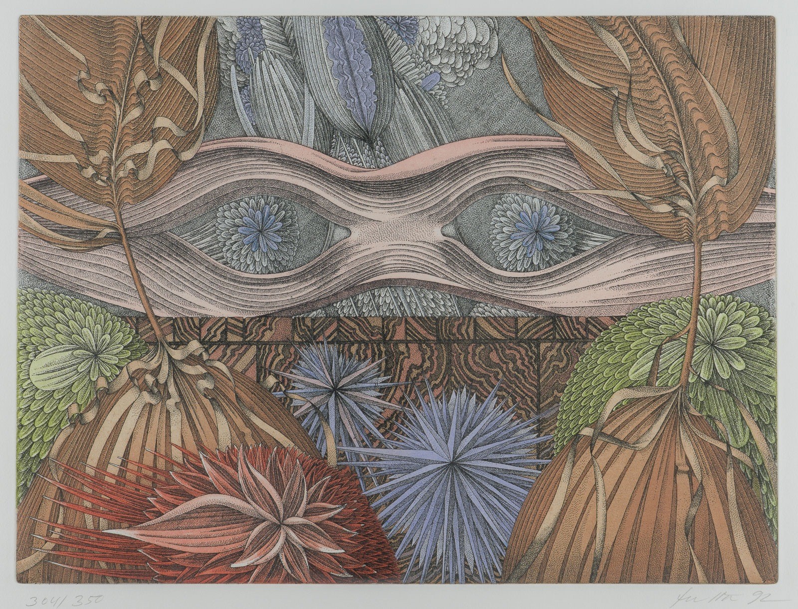 WOLFGANG HUTTER Vienna, Austria 1928 - 2014 EYE FLOWER (1992) AND BIRD-FEATHER (1993) Two coloured etchings on wove paper. Frame dimensions each 64 x 74 cm. Visible size each 33.3 x 43.3 cm. Print size each 29.5 x 39.5 cm. Each signed and dated as well as with copy no. '304/350'. Each framed in passepartout and behind glass (unopened).
