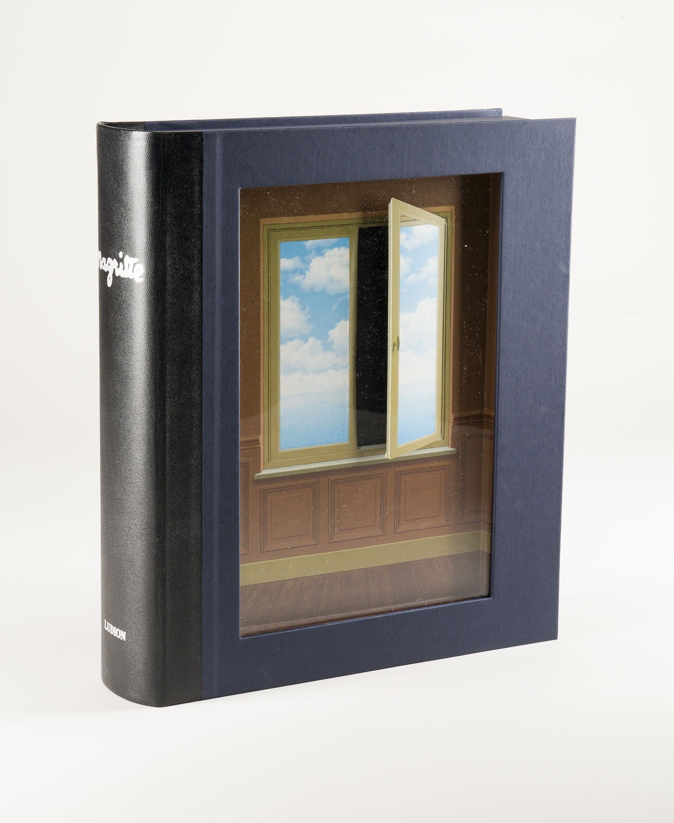 RENE MAGRITTE (NACH) 1898 Lessines, Belgium - 1967 Brussels, Belgium 'DIE BLAUE SCHACHTEL (THE BLUE BOX)' (2003) Published by Daniel Abadie/Ronny Van de Velde. Luxury edition of the exhibition catalogue 'Magritte' of the 'Galerie nationale du Jeu de Paume' with 3 portfolios in original storage half leather box with silver embossing. 37.5 x 32.5 x 8.5 cm. Copy No. 'XXXVII' of 50 Hors de Commerce-Editions. The front of the cassette with trompe-l'oeil-relief 'La Lunette d'approche'. First portfolio including 3 original etchings (Les Amants, Le Viol, La Trahison des images) on wove paper, each signed in the plate and numbered in pencil lower left. The second portfolio with 5 cut-outs of the painting 'L'Evidence éternelle' reproduced in original size on canvas. The third portfolio with 2x8 reproduction prints on adhesive paper of the gouaches 'Bière de porc' and 'Confiture de cheval'. Storage box very slightly rubbed. Provenance: Private collection North-Rhine Westphalia.