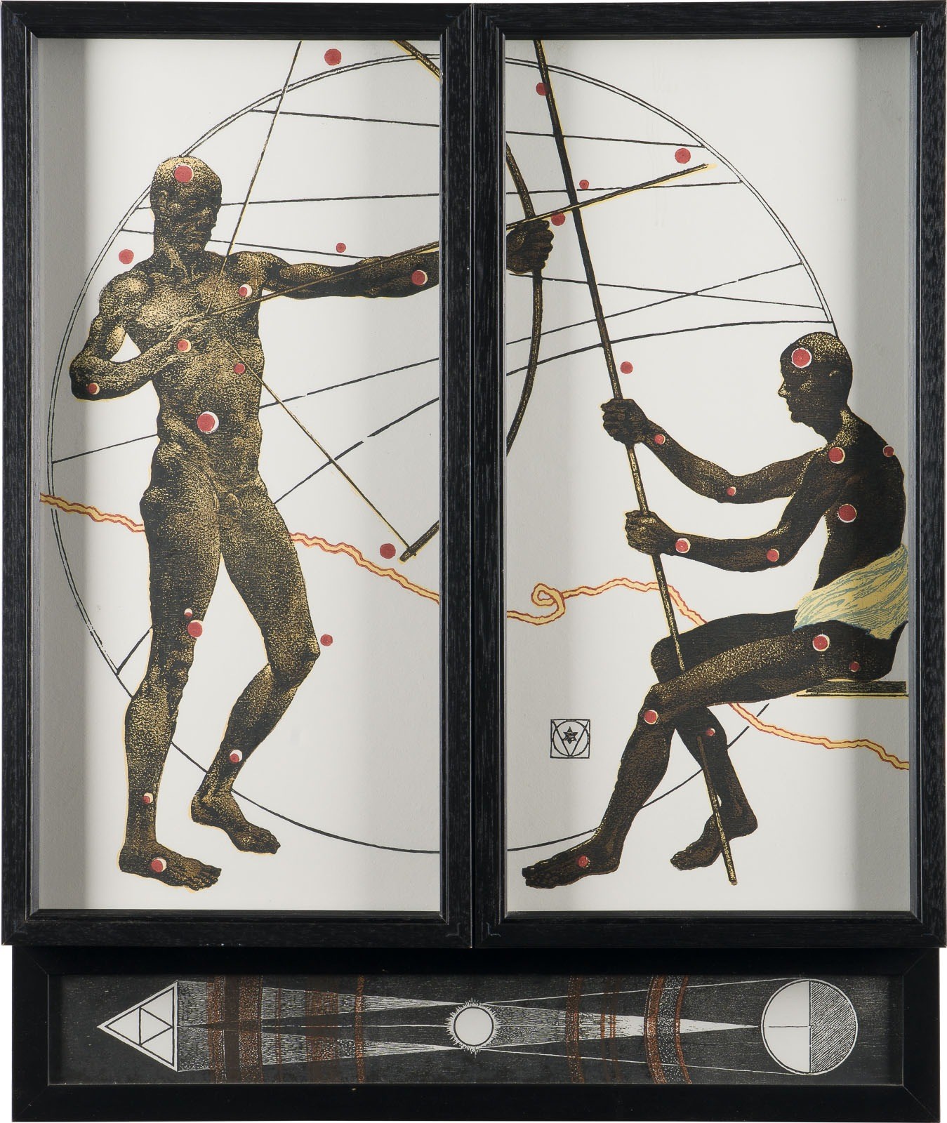 AKOS NOVAKY 1951 Sopron, Hungary - 2022 Leipzig 'DIE LEBENSBAHN (THE COURSE OF LIFE)' (2006) 6 Colour wood cuts on papier in wooden triptych. Total dimensions (opened) 59.8 x 100.5 cm. Signed on the right panel in pencil 'Novaky'. Titled, dated and with copy no. '43/70' on artist's adhesive label on the verso. Each wood cut framed behind glass.
