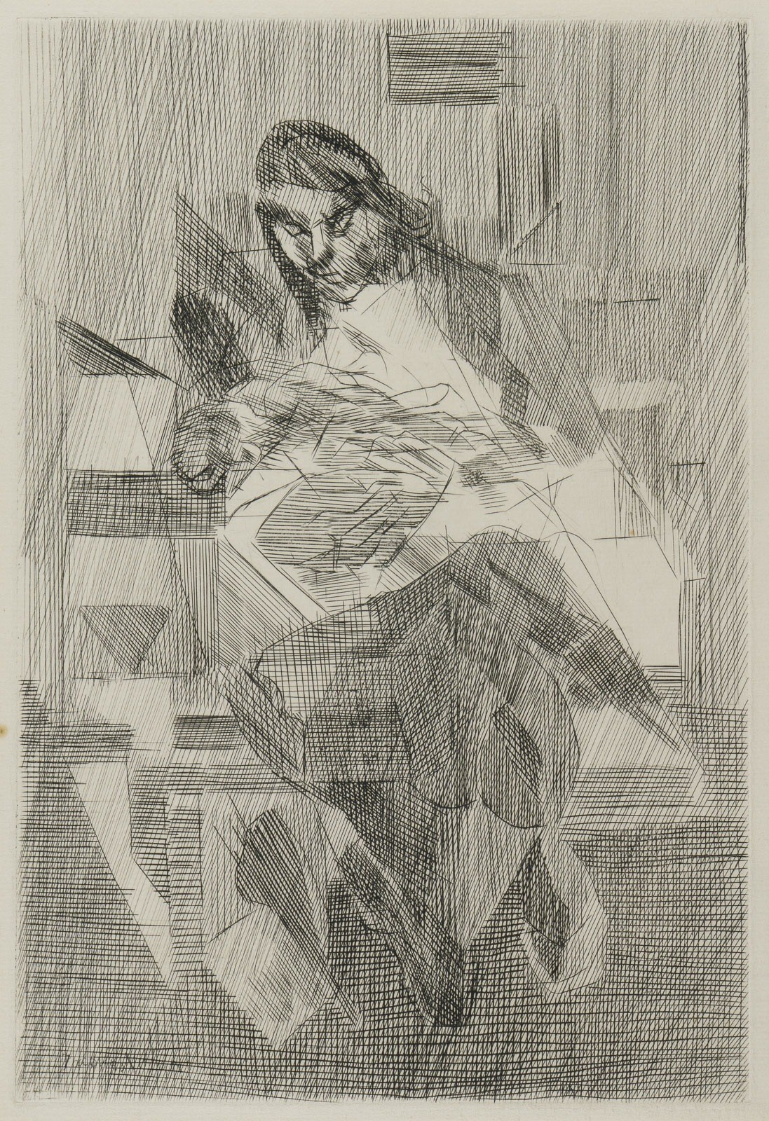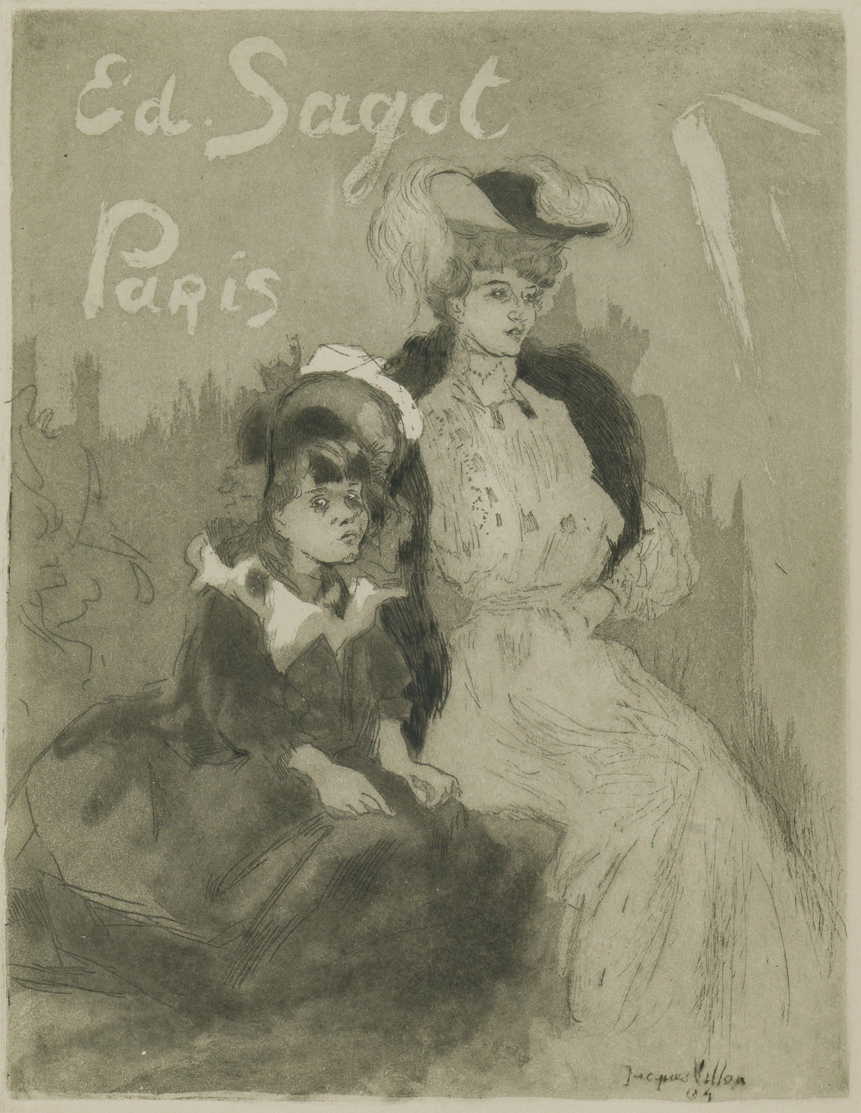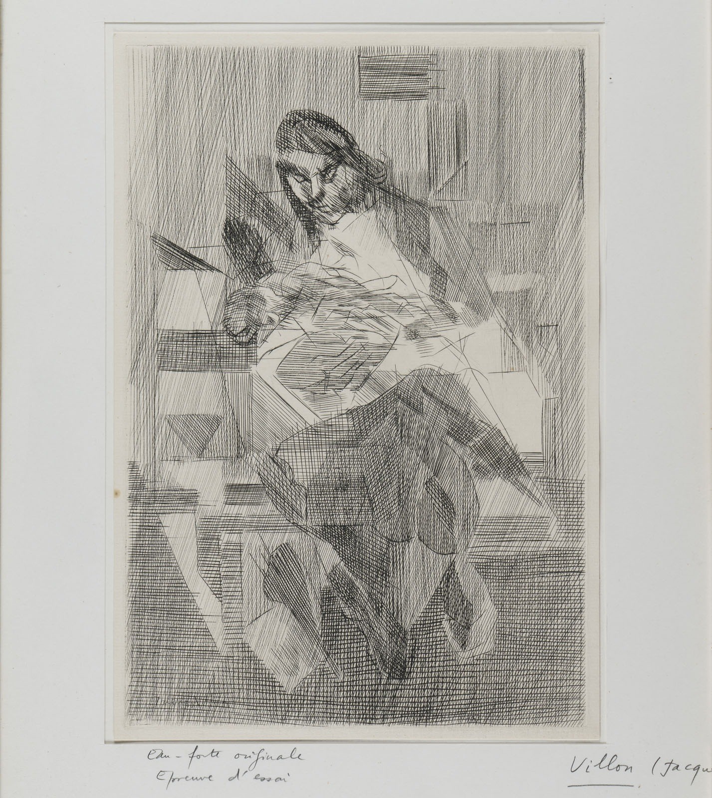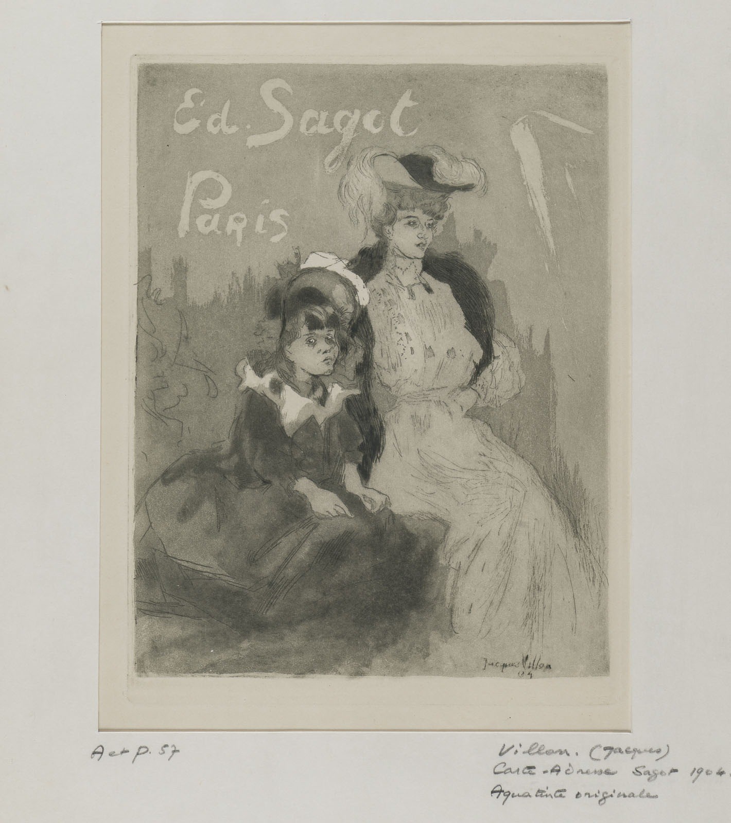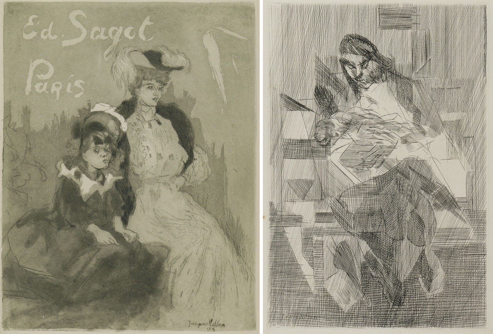 JACQUES VILLON 1875 Damville - 1963 Puteaux bei Paris 'ED. SAGOT PARIS' (1904) AND 'MATERNITE' (1952) Etching and one aquatint on wove paper. Frame dimensions each 41.8 x 31.8 cm. Passe-partout cut-out 25.9 x 19.4 cm. Print sizes 23.8 x 17.9 resp. 27.7 x 18.7 cm. One signed and dated in the plate at lower right 'Jacques Villon 04'. Each additionally inscribed on the passe-partout by an unknown hand. One slightly browned and one with one spot of foxing. Both framed in passe-partout and behind glass (unopened). Provenance: Private collection in the Bergisch region.