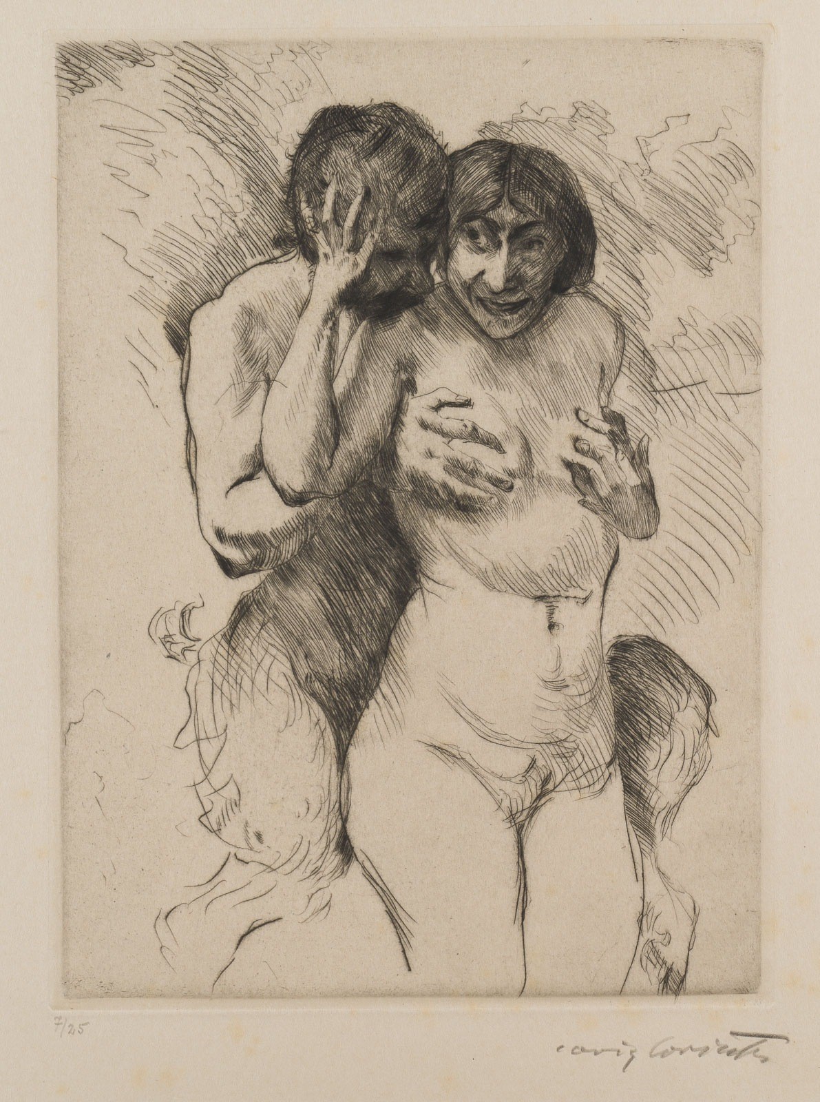 LOVIS CORINTH 1858 Tapiau, Ostpreußen - 1925 Zandvoort, The Netherlands 'FAUN UND NYMPHE (FAUN AND NYMPH)' (1914) Drypoint etching on laid paper. Sheet dimensions 45 x 32.7 cm. Print dimensions 23.7 x 27.7 cm. Signed in pencil at lower right 'Lovis Corinth' as well as with copy no. '7/25' at lower left. With remnants of an old mounting on the verso. Slightly browned, slight foxing. Unframed.
