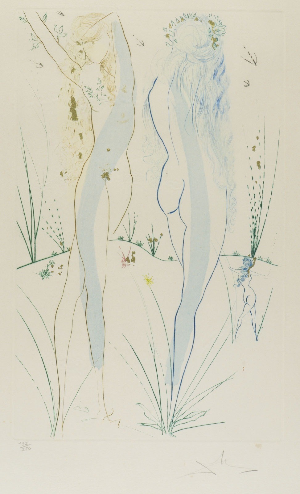 SALVADOR DALI 1904 Figueres, Girona - 1989 ibidem 'RETURN, RETUNR SHULAMITE' (1971) from: The Song of Songs of Solomon Colour etching with pochoir and gold overlay on Arches. Frame dimensions 60 x 41.5 cm. Visible size 56 x 37 cm. Print size 40 x 25 cm. Signed in pencil at lower right 'Dalí' and with copy no. at lower left '137/250'. Partially slight foxing, browned and light-stained. Framed behind glass (unopened). Literature: Michler/Löpsinger 479 c.