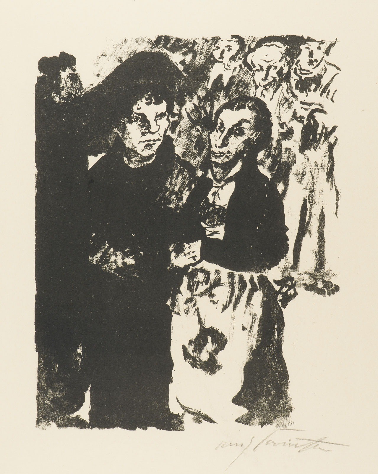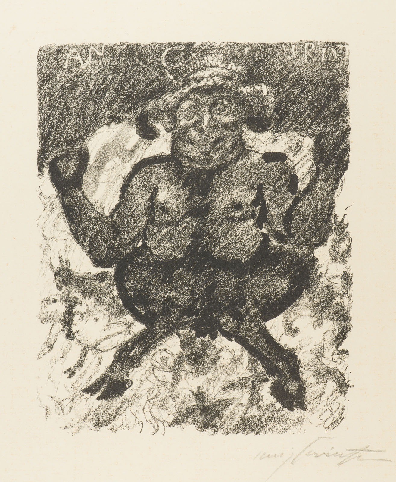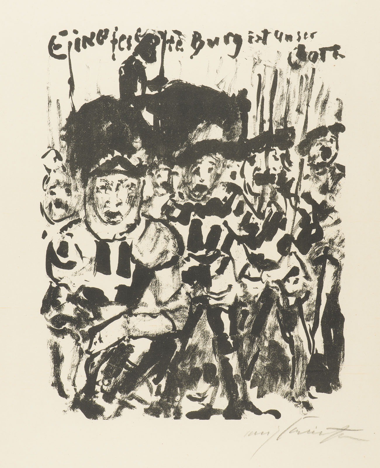 LOVIS CORINTH 1858 Tapiau, East Prussia - 1925 Zandvoort, Netherlands COLLECTION OF FOUR SHEETS FROM THE BOOK 'MARTIN LUTHER' (1920) WITH ORIGINAL LITHOGRAPHS BY LOVIS CORINTH AND TEXT BY TIM KLEIN, PUBLISHED BY VERLAG FRITZ GURLITT BERLIN 'ANTI CHRIST'/'A MIGHTY FORTESS IS OUR GOD'/'LUTHER AND CATHARINA VON BORA'/'LUTHER AND THE LEGATE VERGERIO' Lithograph on vellum. F 59,5 x 50,5 cm resp. 53 x 45 cm. Visible size 40 x 32 cm resp. 39,5 x 32,8 cm. Print size each. 32 x 25 cm. Each signed in pencil lower right 'Lovis Corinth'. Part. handling marks, part. slightly foxed. Each mounted and framed beind glass (unopened).