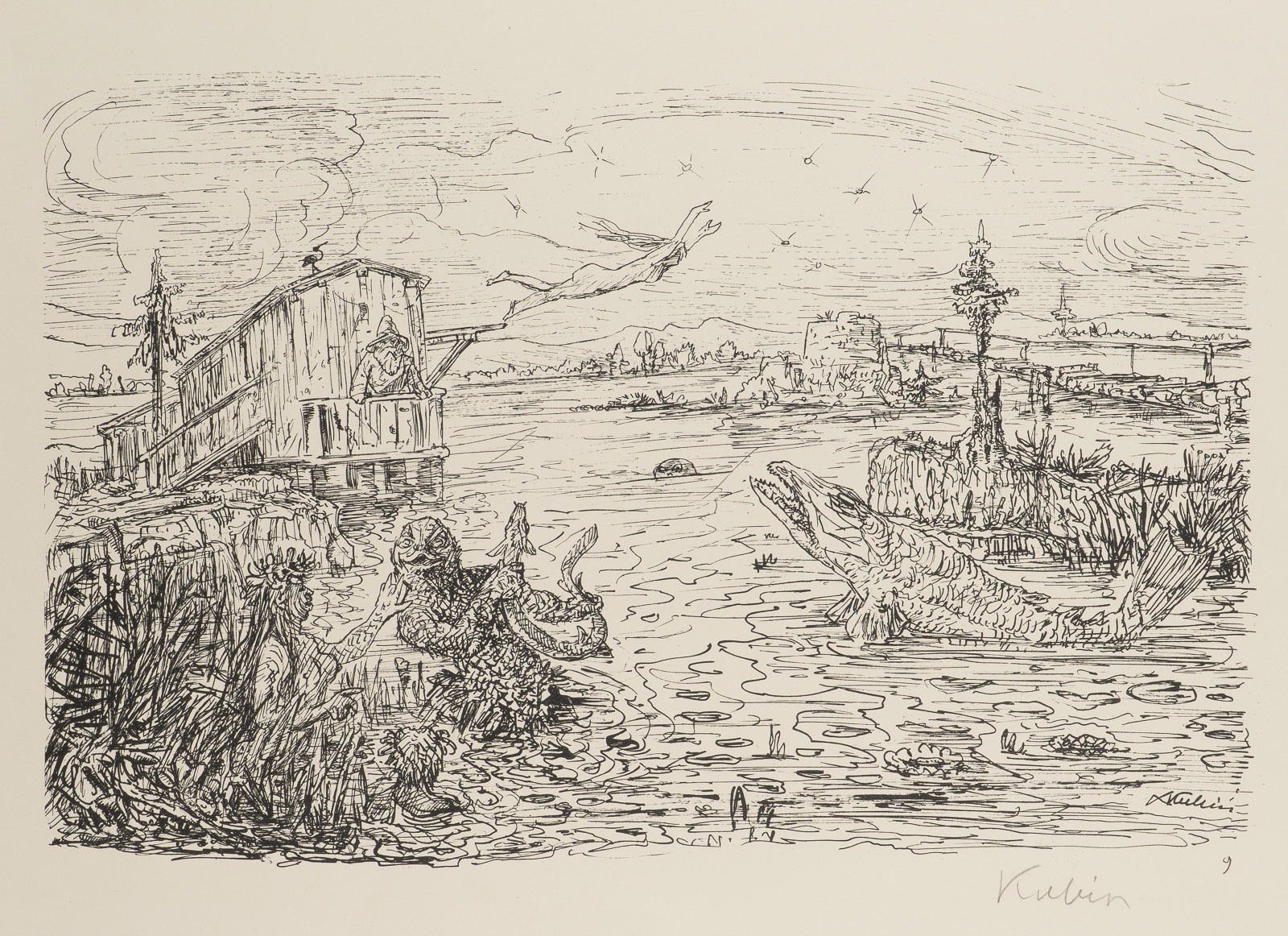 ALFRED KUBIN 1877 Leitmeritz/Böhmen - 1959 Wernstein am Inn 'LEVIATHAN' (1925) Sheet 9 of the portfolio: Rauhnacht Lithograph on wove paper. Sheet dimensions 36 x 46.7 cm. Print dimensions 24.7 x 37.8 cm. Signed in print and additionally signed in pencil at lower right. Inscribed in pencil by an unknown hand on the verso and with remnants of an old mounting. Slight handling marks and minor staining. Unframed.