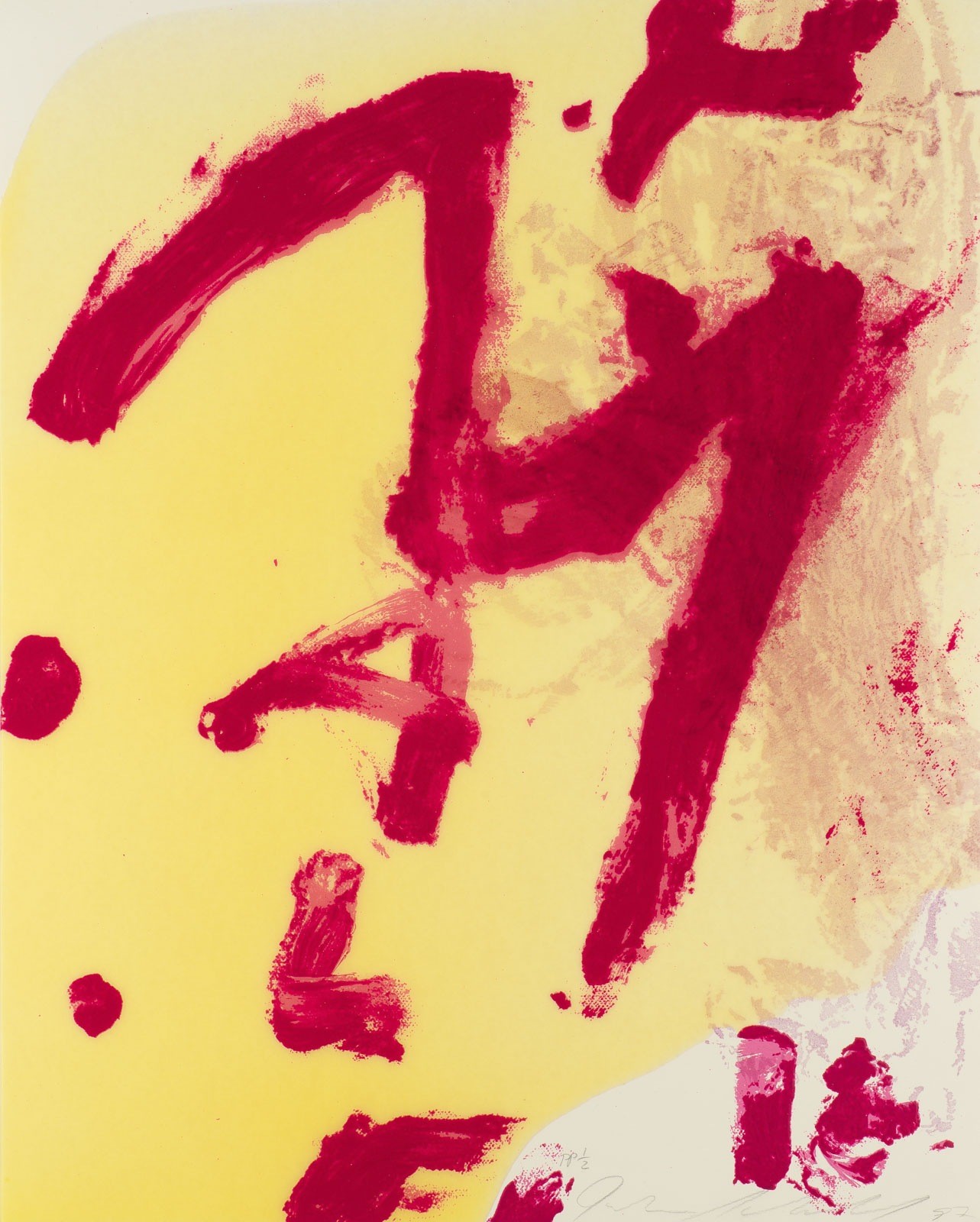 JULIAN SCHNABEL 1951 New York City, USA 'MALFI' (1997) Part of the triptych of the same name from the portfolio Sequences Colour serigraph with monotype and synthetic resin on firm cardboard. Sheet dimensions 50 x 40 cm. Signed and dated in pencil lower right 'Julian Schnabel (19)97' as well as inscribed 'PP 1/2'. Remnants of old mounting on the verso. Lower right corner with small crease mark. Verso: Rückseitig mit Resten alter Montage. Die untere rechte Ecke m. kl. Knickspur. Mounted twice in passepartout on the upper side. Provenance: Private collection North Rhine-Westphalia