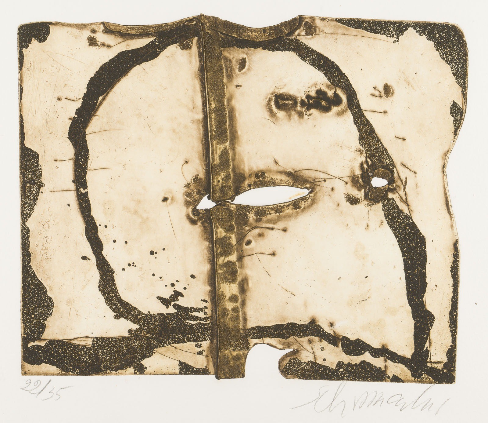 EMIL SCHUMACHER 1912 Hagen - 1999 Ibiza UNTITLED Etching and embossing on handwoven cardboard. F 44,7 x 54,7 cm. Visible size 39 x 49 cm. Print size 22,5 x 27,5 cm. Signed in pencil lower right 'Schumacher', num. '22/35' lower left. Part. min. foxed. Framed behind glass (unopened). Provenance: Private collection North Rhine-Westphalia.