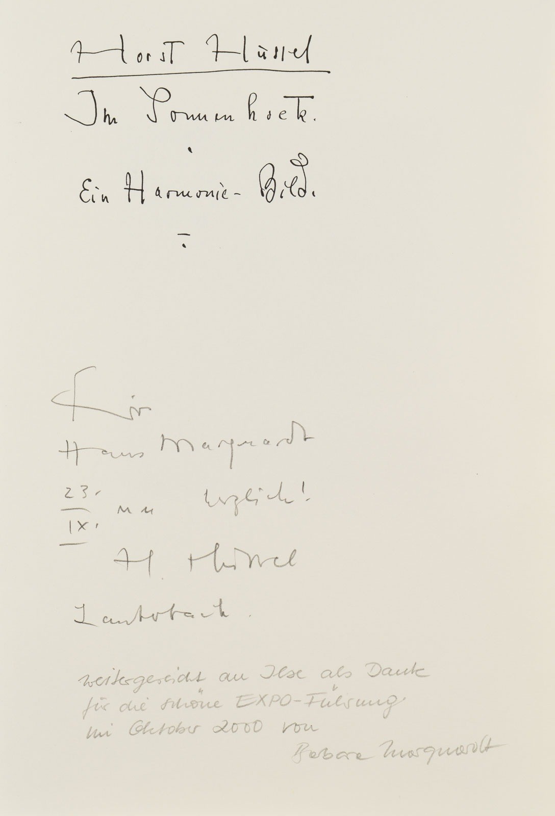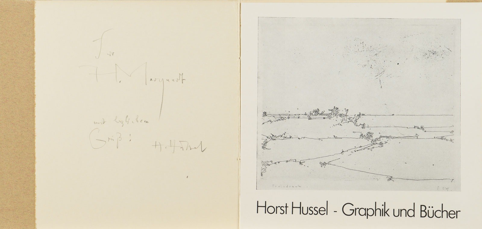 HORST HUSSEL 1934 Greifswald - 2017 Berlin TWO WORKS 'DER RASENDE ROLAND' (2000) AND 'IM SONNENHOEK. EIN HARMONIE-BILD' (1993) Etching on wove paper, with watermark/ Booklet with etching in colour 'Am Achterwasser' on wove paper. Frame dimensions 23 x 24 cm. Sheet dimensions 19.8 x 21 cm. Print size 11.9 x 13.8 cm. Booklet 30.2 x 21.3 cm. Etchings each signed in pencil lower right 'Hussel', one additionally titled, numbered 'X/X' and dated lower left. The booklet with personal dedication and copy no. '33'. As an addition: 'Horst Hussel - Graphik und Bücher', signed and with personal dedication at the first page. One etching framed behind glass (unopened). Provenance: Rhenish private collection.