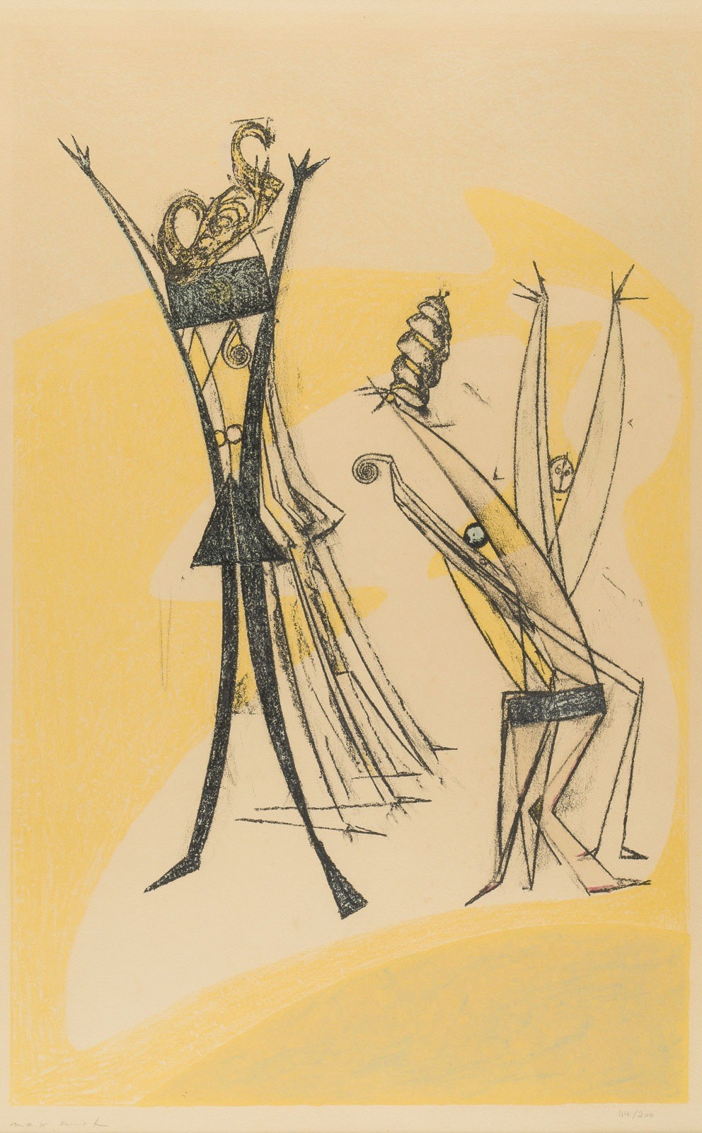 MAX ERNST 1891 Brühl - 1976 Paris 'RHYTHM' (1950) Colour lithograph on Arches. F. 75,3 x 58,8 cm. Visible size 46 x 30,5 cm. Print size 42,5 x 27 cm. Signed 'max ernst' lower left, num. '44/200' lower right. Min. irregularly browned, slightly faded. Mounted and framed behind glass (unopened).