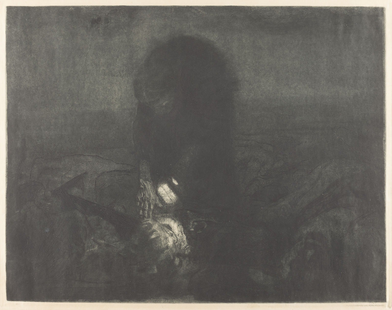 KÄTHE KOLLWITZ 1867 Königsberg - 1945 Moritzburg 'BATTLEFIELD' (1907/1921) Sheet 6 from the cycle 'Peasants War' Etching, aquatint and print-through on vellum. Print size 41 x 52,7 cm, visible size 43,5 x 54,5 cm (f. 61,5 x 71,5 cm). Stamped at lower right 'Original etching by Käthe Kollwitz 1921'. Browned, light margins, min. foxing. Framed behind glass (unopened). Provenance: Private collection Düsseldorf.