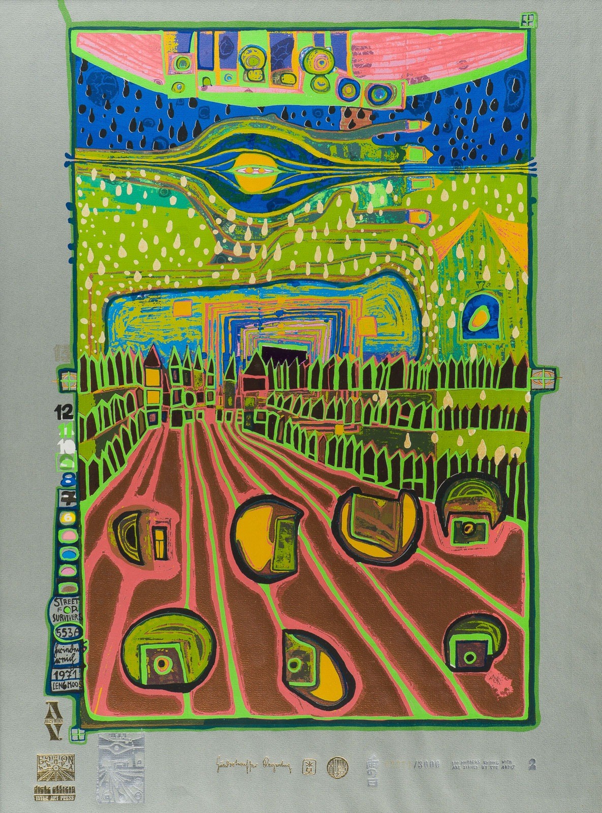 FRIEDENSREICH HUNDERTWASSER 1928 Vienna - 2000 Pacific Ocean 'STREET FOR SURVIVORS' (1972) Sheet 2 of: Look at it on a rainy day Colour serigraph with metal embossing on grey-greenish cardboard, published by Ars Viva, Zürich. Frame dimensions 68.5 x 50.5 cm. Visible dimensions 66 x 48 cm. Below the depiction with embossed stamps of the publisher and printer as well as mechanically numbered '2271/3000'. Paper very slightly wavy. Framed behind glass (unopened). Literature: HWG 45. Provenance: Private collection Düsseldorf.