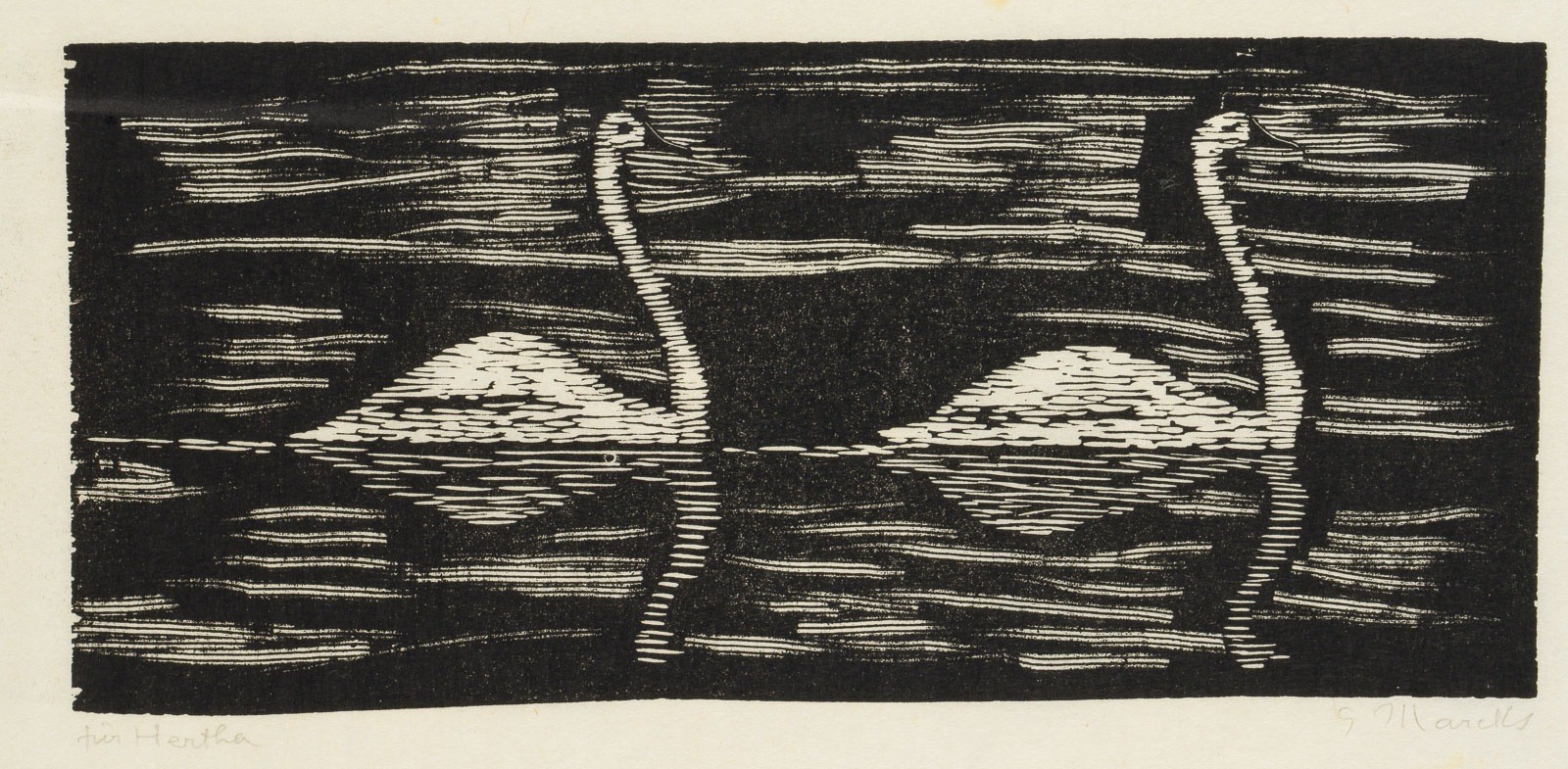 GERHARD MARCKS 1889 Berlin - 1981 Burgbrohl 'ZWEI SCHWÄNE (TWO SWANS)' (1959) Woodcut on japan paper. Sheet size 20.5 x 49.5 cm. Print size 13.7 x 31.2 cm. Signed in pencil lower right 'G. Marcks' and with personal dedication lower left. Partially wavy, with handling marks and partially slightly stained. Unframed. Literature: Catalogue raisonné no. H304.
