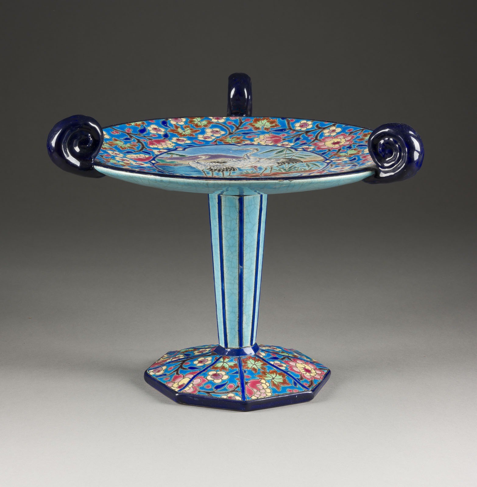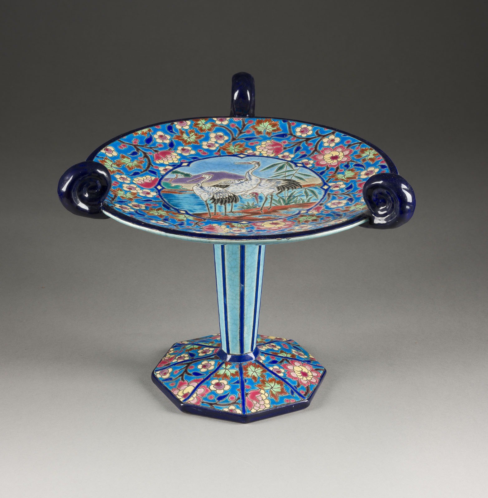 Keramik, heller Scherben, polychrom glasiert. H. 27,5 cm. Manufakturstempel, Dekornr. '5670'. Oktogonaler Fuß mit facettiertem Schaft. Darauf flache Schale mit drei Voluten. Im Spiegel