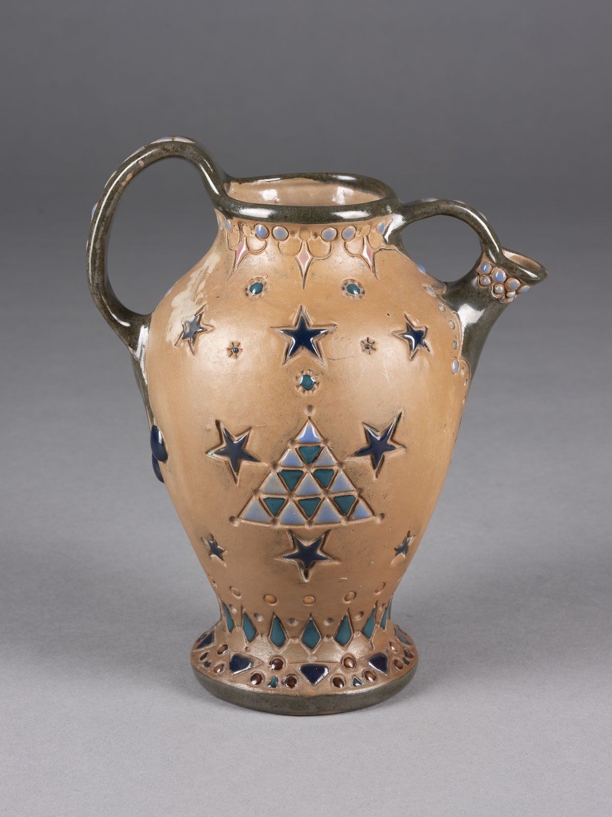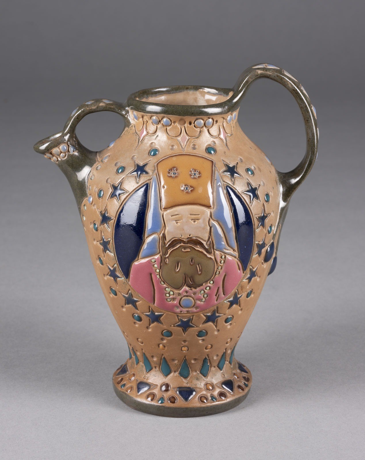 Keramik, heller Scherben, bunt glasiert. H. 20 cm. Im Boden Prägemarke, 'Amphora', 'Austria', 'Modellnr. '118 92/87'.