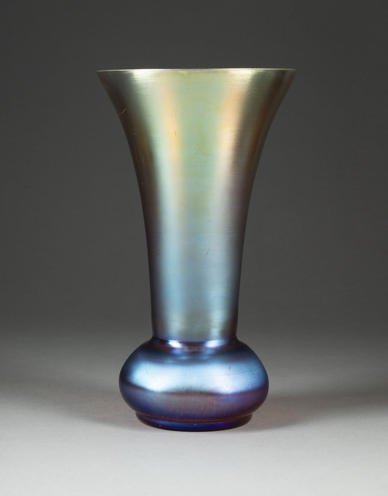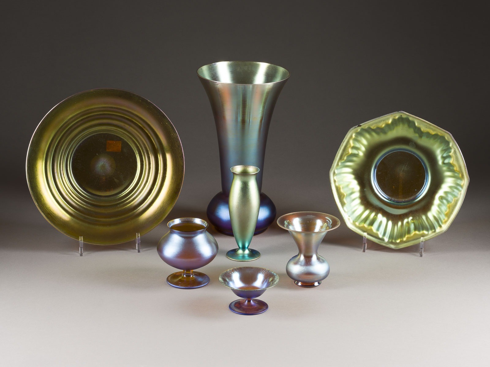 Sog. 'Myra'-Glas, matt irisiert. H. 30 cm (Vase). Eine Vase und eine Schale am Rand part best. Bestehend aus: 4 Vasen, 1 kl. Fußschale, 2 Schalen.